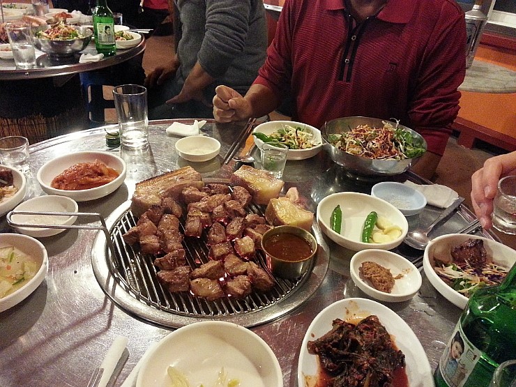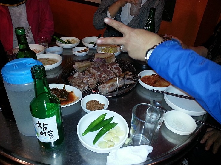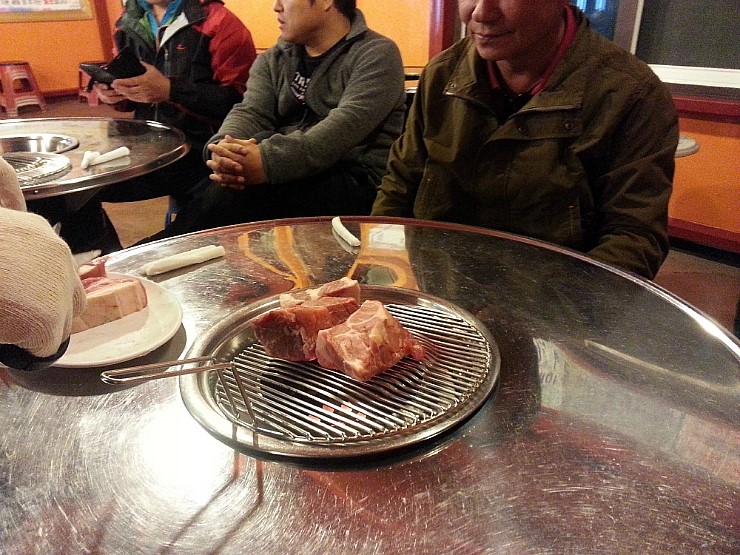 그래도 다들 일단 고기에 대한 기대를 하고 와서 인지 구워지는 동안 즐거운 마음으로 기다릴 수 있었다. 커다란 고기를 겉에서 익은 부위를 중심으로 갈라 나가다 보면 나중에 먹기 적당한 정도의 크기로 된다. 하지만 좀 기다리는 시간이 오래 걸린 것은 사실이다. 과연 관광의 맛으로 볼 것인가 괜히 비싼 고기를 오래 기다린다는 현실적인 부분에서 평가를 할 것인가? 잘 모르겠다. 하지만 우리는 회식을 시작했고 술도 몇 잔씩 돌아갔다.