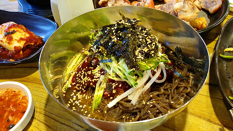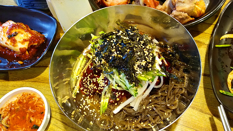 보쌈도 함께 파는 집이다 보니 반찬처럼 나온 무김치와 배추김치도 예술이었다. 우린 이것을 눈치 봐가며 두 번이나 리필을 해서 먹었다. 그렇게 족발 삼매경에 빠져 있는데 동생이 내가 워낙 막국수 좋아하는 취향이라는 것을 알고 막국수도 먹자고 했다. 하긴 처음부터 나는 이 국수가 먹고 싶긴 했다. 느끼하고 기름진 족발을 먹다가 마치 사막의 오아시스라도 만나는 느낌처럼 담백하고 시원한 막국수를 만난다면 이 얼마나 행복한 일이랴! 막국수 전문점의 그 맛은 아닐지라도 이날의 막국수는 안주도로 식사로도 손색이 없었다.