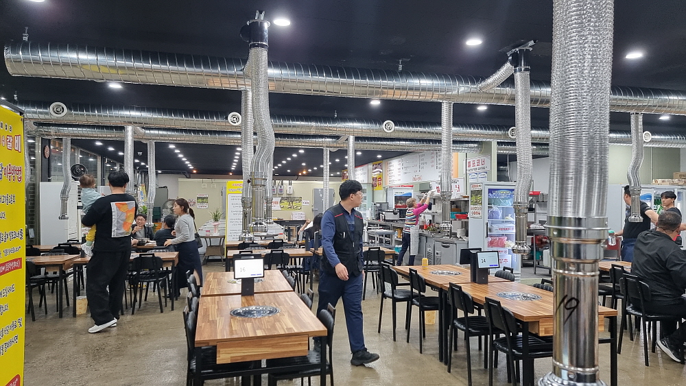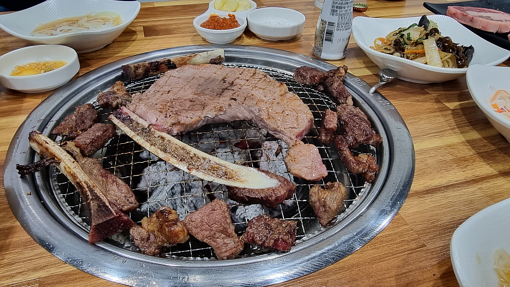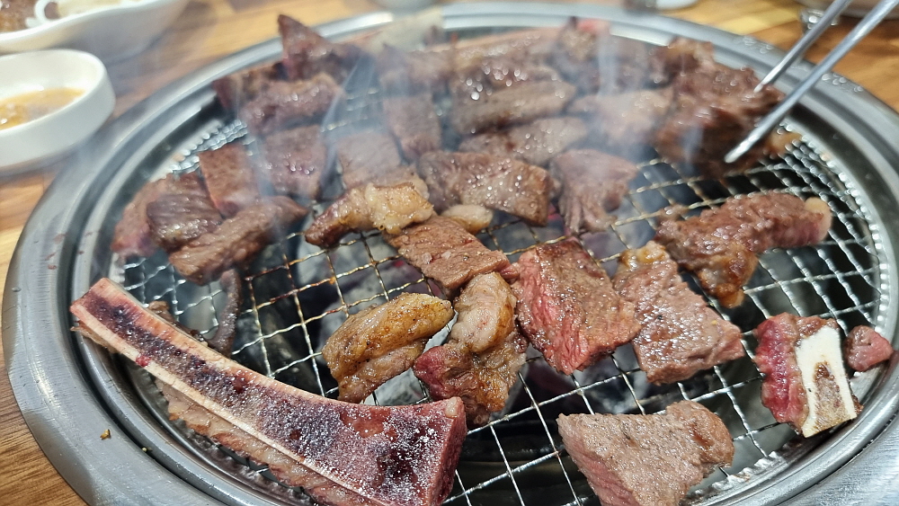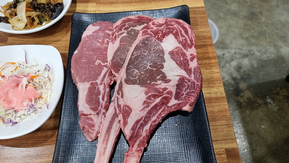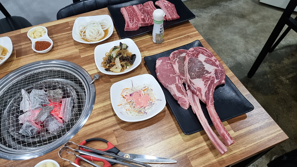 자리에 앉으니 미리 주문한 고기가 나와 있었다. 정말 영상으로 보았던 토마호크가 맞았다. 수입고기겠지만 일단 비주얼은 아주 맛나 보였다. 소고기는 익히는 것도 기술이 중요한데 과연 우리가 이렇게 생소한 고기를 잘 구울 수 있을까? 이곳은 가격이 저렴한 대신 웬만한 것은 손님이 알아서 해야 한다. 물론 서빙을 해달라고 해도 되지만 실내가 넓게 때문에 필요한 것이 있으면 그냥 본인이 갖다 먹는 것이 속 편하다. 벌겋게 달아 오른 숯불에 고기를 올리니 치치직 하는 소리와 함께 고기 굽는 냄새가 진동했다. 마치 야외에서 캠핑을 하면서 먹는 것처럼 말이다.