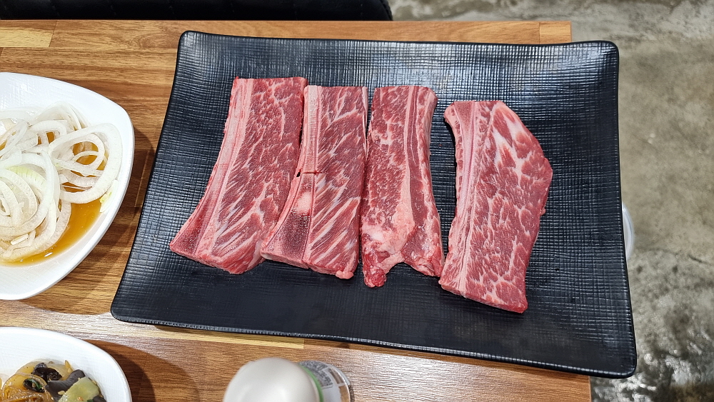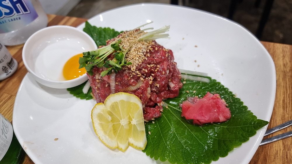 굽는 고기가 조금 질릴 무렵 우리는 육회라는 아이템을 추가했다. 고기 맛을 아는 사람들은 구운 고기보다 역시 이렇게 날 것을 먹어야 한다. 달달한 양념을 넣고 육회에 빠지면 안 되는 날 계란 노른자를 넣어 잘 비벼 먹는다. 이집의 육회는 가성비가 좋은 편이다. 이것 역시 소주 안주로 그만이다. 이런 메뉴를 자꾸 시키면 안 된다. 너무 과음을 하게 되기 때문이다. 누군가는 여기 갈비탕이 푸짐하니 좋다고 했다. 그러니 여길 몇 번은 더 와야 할 것 같다. 이날은 돼지고기는 먹지 못했다. 하지만 이베리코 돼지고기가 그렇게 맛좋다 하니 그것도 나중에 먹어 보는 것으로...
