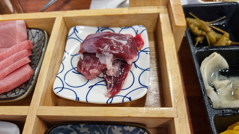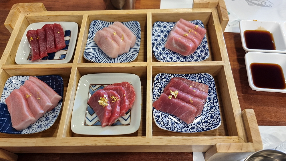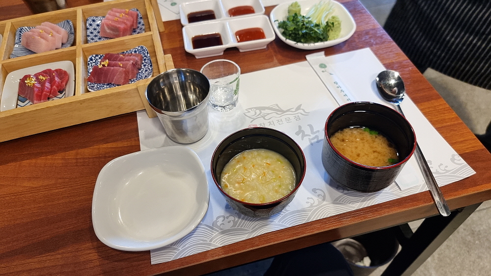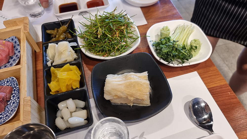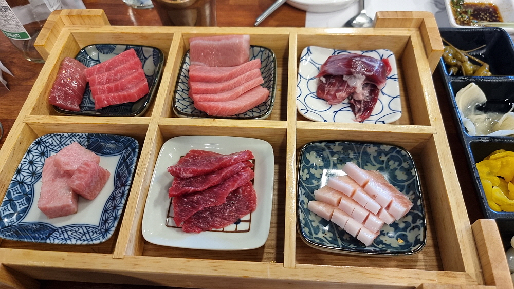 가는 날이 장날이라고 마침 우리가 들어갔을 때 전기 용량 때문에 에어컨이 고장이 났단다. 수리기사가 올 때까지 한 시간은 넘게 기다려야 한다는데 워낙 참치에 대한 욕구가 강했기 때문에 우린 그냥 선풍기에 의지하여 참치를 먹기로 했다. 이런 과감하고 무모한 도전이 또 있을까? 하지만 우린 그랬다. 가장 기본인 일인당 40,000원 짜리를 주문했다. 참치의 생명은 얼마나 잘 해동하느냐인데 일단 나온 참치를 보니 주인장의 전문가적인 실력을 잘 엿볼 수 있었다. 과연 이런 비주얼이 참치 맞다. 날이 워낙 더워 빨리 해동이 되기 때문에 우린 서둘러 먹기 시작했다.