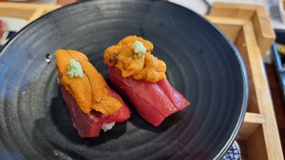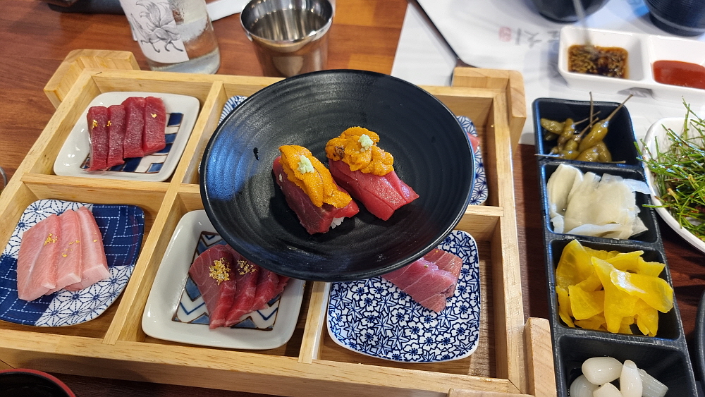 원래 이 가격에 이런 다채로운 구성이 나오는 것인지 더운날 에어컨이 고장나서 미안해서 그런 것인지 4만원짜리 라고 하기엔 너무 다양한 참치들이 나왔다. 황송할 지경이었다. 성게알을 올린 참치라니 상상도 하지 못했다. 술 안주라 한 번에 먹어버리기엔 너무나 아쉬운 비주얼이었다. 참치는 손님들을 아주 화려한 파티에 참석한 사람들로 만들어 주는 묘한 매력이 있다. 한 사람에 몇 십만원 한다는 오마카세 집의 요리가 부럽지 않은 정말 고급진 안주였다. 이런 맛에 좀 비싸도 참치집을 찾는 것 아니겠는가?