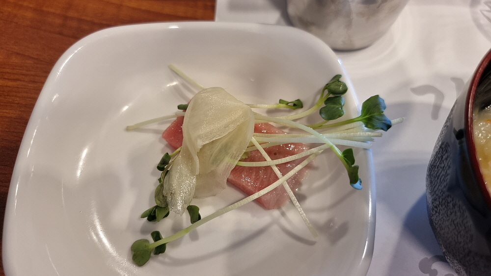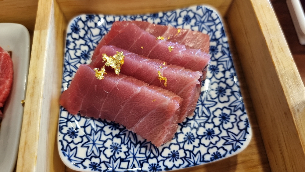 가는 날이 장날이라고 마침 우리가 들어갔을 때 전기 용량 때문에 에어컨이 고장이 났단다. 수리기사가 올 때까지 한 시간은 넘게 기다려야 한다는데 워낙 참치에 대한 욕구가 강했기 때문에 우린 그냥 선풍기에 의지하여 참치를 먹기로 했다. 이런 과감하고 무모한 도전이 또 있을까? 하지만 우린 그랬다. 가장 기본인 일인당 40,000원 짜리를 주문했다. 참치의 생명은 얼마나 잘 해동하느냐인데 일단 나온 참치를 보니 주인장의 전문가적인 실력을 잘 엿볼 수 있었다. 과연 이런 비주얼이 참치 맞다. 날이 워낙 더워 빨리 해동이 되기 때문에 우린 서둘러 먹기 시작했다.