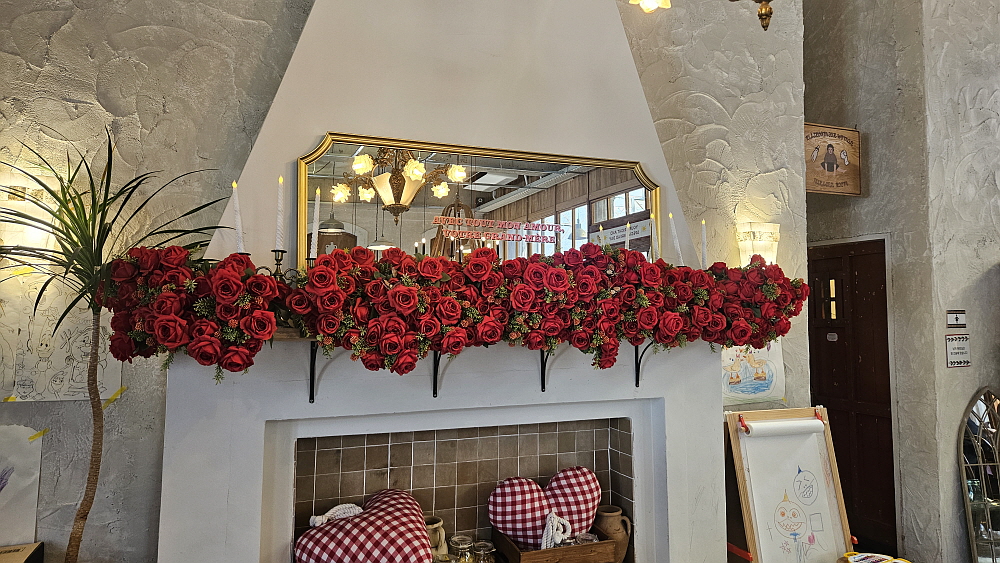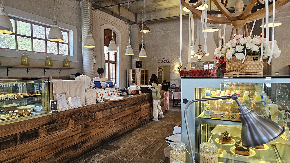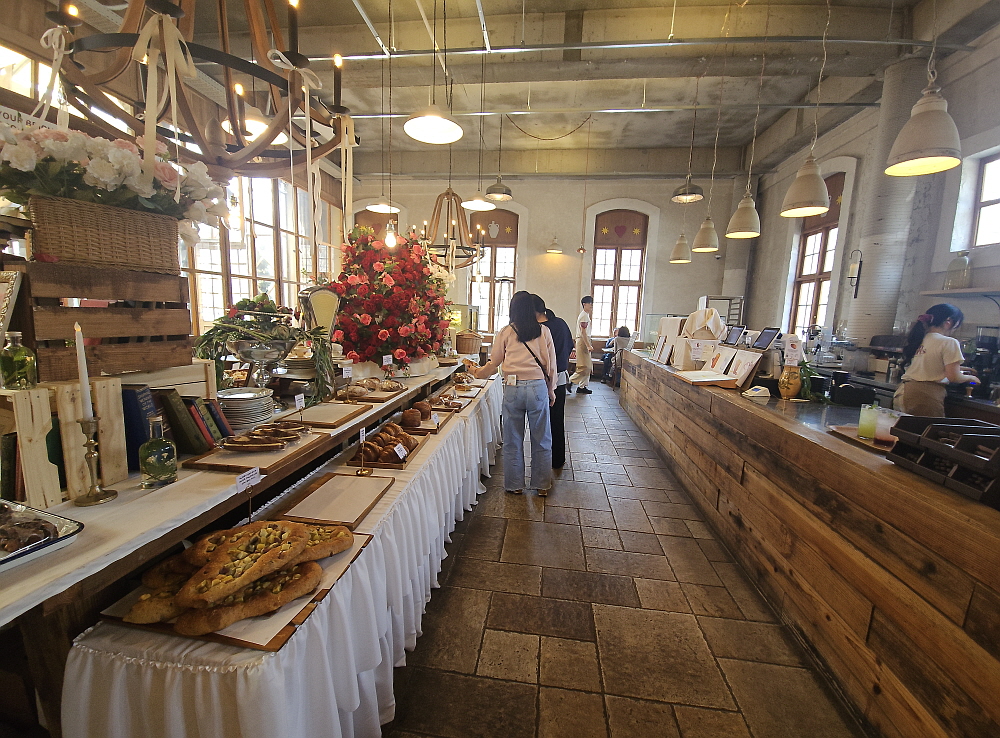 성처럼 생긴 외형이 일단 찾아가는 사람을 약간 압도하는 분위기는 있다. 주차장이 이렇게나 넓은데도 주말엔 차를 세우지 못해 대로변으로 차들이 난립을 하기 때문에 북새통을 이룬다. 평일엔 그래도 그 정도의 인파가 몰리지는 않는다. 실내로 들어가보니 특이한 인테리어가 눈에 띄기는 했다. 유럽풍이라는 거창한 수식어를 붙이기는 좀 그래도 뭔가 특이하고 이국적인 분위기인 것은 사실이었다. 사실 실내를 돌아다녀 보니 카페라 하기보다는 그냥 커다란 빵집이라 하는 편이 맞는 것 같았다. 어디가나 빵 냄새가 진동하고, 진열장에는 이런 저런 빵들이 가득했다.