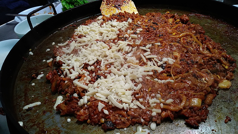 그런데 추가 메뉴인 우동도 금새 바닥이 나고 결국 우리는 마지막 코스라는 볶음밥까지 먹게 되었다. 거기에 내가 좋아하는 치즈를 얹어 먹기로 했다. 물론 아재인 우리 일행 중에 한 사람은 치즈가 싫다고 했다. 내 이럴줄 알았다. 아재들의 입맛에 치즈가 맞지 않는다는 것쯤은 알고 있었다.그래서 주인에게 반반씩 나누어 볶어 달라는 주문을 했다. 이러면 치즈를 즐기는 사람과 볶음밥 본연의 맛을 즐기는 사람이 모두 불만이 없는 것 아니겠는가? 이 볶음밥이 사실 신의 한수였다. 앞에 먹었던 그 어떤 것보다 이 밥이 압권으로 맛이 좋았다. 결국 우리는 이 밥을 먹기 위해 그렇게 부지런히 젖가락을 놀리며 이 커다란 팬 위를 방황했던 것이다.