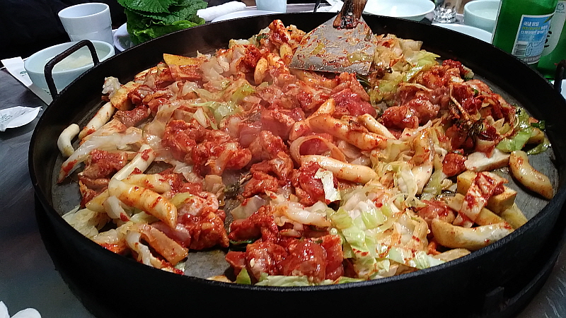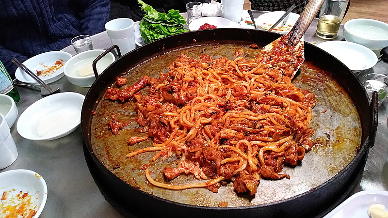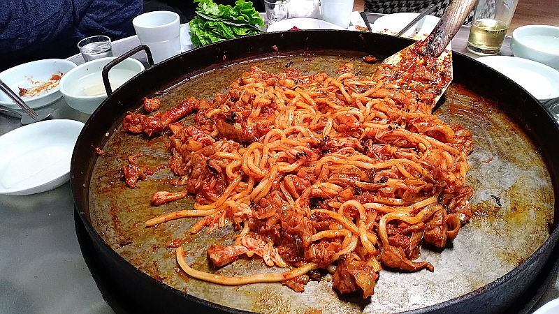 먹는 사람이 다섯이다 보니 내가 수다 삼매경에 빠져 있는 동안 닭갈비는 바닥을 보이기 시작했다. 일미닭갈비에서도 그렇지만 이럴 땐 우동사리 만한 것이 없다. 달달한 양념에 비비듯이 볶아 먹는 우동면은 마치 일본의 볶음우동같은 맛이 난다. 이것은 또한 훌륭한 안주가 되는 법이다. 닭갈비를 그닥 좋아하지 않는 사람들 중에는 먹을 것이 너무 없다는 불만을 이야기 하는 사람들이 있다. 닭고기는 정작 얼마 되지도 않고 야채와 다른 재료들이 더 많다고 한다. 그런데 나는 이렇게 닭고기 이외의 다른 음식들이 더 좋다. 고구마도 떡도 양배추도 참 좋다. 이런 것들이 나에겐 주식이나 마찬가지이다. 거기에 부드럽고 쫄깃한 우동면이 들어가면 정말 또 다른 2라운드 경기가 시작되는 것 같은 기분이다.