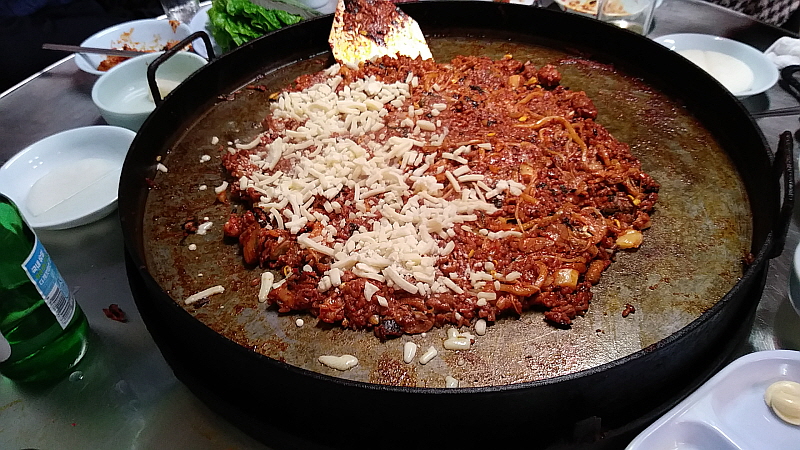 그런데 추가 메뉴인 우동도 금새 바닥이 나고 결국 우리는 마지막 코스라는 볶음밥까지 먹게 되었다. 거기에 내가 좋아하는 치즈를 얹어 먹기로 했다. 물론 아재인 우리 일행 중에 한 사람은 치즈가 싫다고 했다. 내 이럴줄 알았다. 아재들의 입맛에 치즈가 맞지 않는다는 것쯤은 알고 있었다.그래서 주인에게 반반씩 나누어 볶어 달라는 주문을 했다. 이러면 치즈를 즐기는 사람과 볶음밥 본연의 맛을 즐기는 사람이 모두 불만이 없는 것 아니겠는가? 이 볶음밥이 사실 신의 한수였다. 앞에 먹었던 그 어떤 것보다 이 밥이 압권으로 맛이 좋았다. 결국 우리는 이 밥을 먹기 위해 그렇게 부지런히 젖가락을 놀리며 이 커다란 팬 위를 방황했던 것이다.
