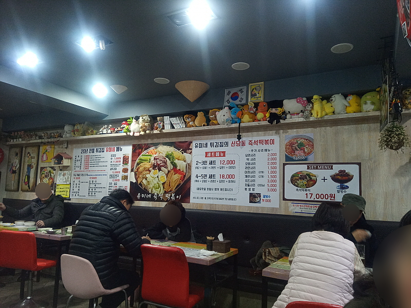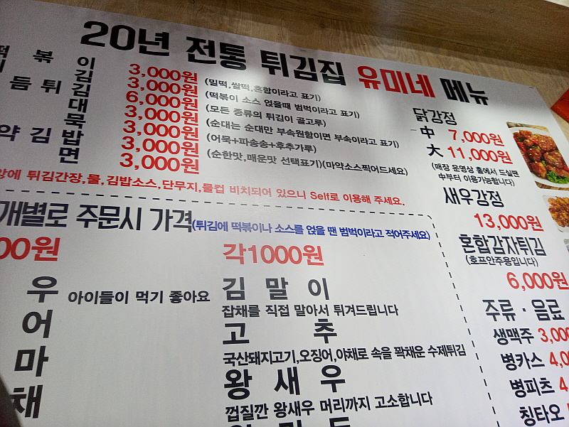 전형적인 서민동네인 이곳 창동역 일대는 예전에도 가성비 좋은 가게들이 많았다. 주머니 가벼운 서민들의 맘 편한 먹자골목이었다. 거리에서 우연히 보게 된 이곳 유미네 튀김집도 그런 분위기였다. 떡볶이 한 접시와 오뎅을 먹을 수 있는 편안한 동네 가게 같은 곳이었다. 그리고 굳이 안에 들어가 먹으라는 주인장의 권유로 들어가 보니 참 특이한 컨셉의 식당이라는 것을 알 수 있었다. 학생들이 주로 단골이 될 것 같은 분식집 메뉴들이 많았지만 닭강정 같은 음식도 있었고, 생맥주와 소주, 막걸리 까지 팔고 있었다. 한 쪽에서는 초등학생들이 떡볶이를 먹고, 한 쪽에서는 아재들이 생맥주 잔을 기울이며 함께 음식을 먹는 곳이었다.
