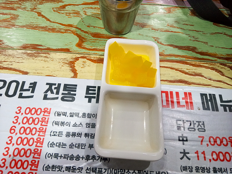 그것이 가능한 이유가 바로 이 가게의 다양한 메뉴들 때문이다. 떡볶이와 오뎅, 순대와 닭강정 그리고 즉석 떡볶이와 튀김까지 거의 전 연령의 사람들을 손님으로 받겠다는 강력한 의지의 표현 같았다. 의정부 제일시장에서 처럼 우리는 간단하게 떡볶이와 오뎅만 먹고 가려고 했는데 이렇게 되면 뭔가를 더 주문해야 하나? 싶은 생각마저 들게했다. 참 대단한 마케팅 전략이다. 라면 한 그릇의 가격이 3,000원 이면 꽤나 저렴한 동네 가게가 맞는 것 같은데 어묵 한 그릇에 3,000원 이면 좀 비싼 것 같기도 하고 참 가늠이 잘 안 되는 판매 가격이었다.