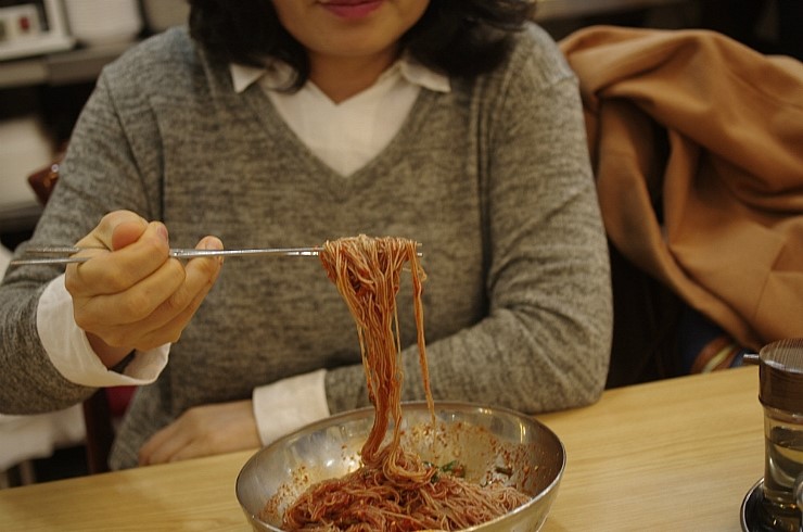마치 터미널에서 표 내주는 곳 처럼 생긴 저 곳에서 냉면들이 나왔다. 주방의 모습이며 종업원들의 움직임이 정말 과거 그대로 였다. 아내는 회냉면을 나는 물냉면을 주문했다. 아내는 늘 냉면하면 회냉면이다. 반면 나는 냉면하면 꼭 물냉면을 시킨다. 역시 냉면은 차고 달달한 저 국물이 생명 아닌가? 하지만 이날의 회냉면은 그런 내 마음을 비웃는 것처럼 비주얼이 너무 좋았다.