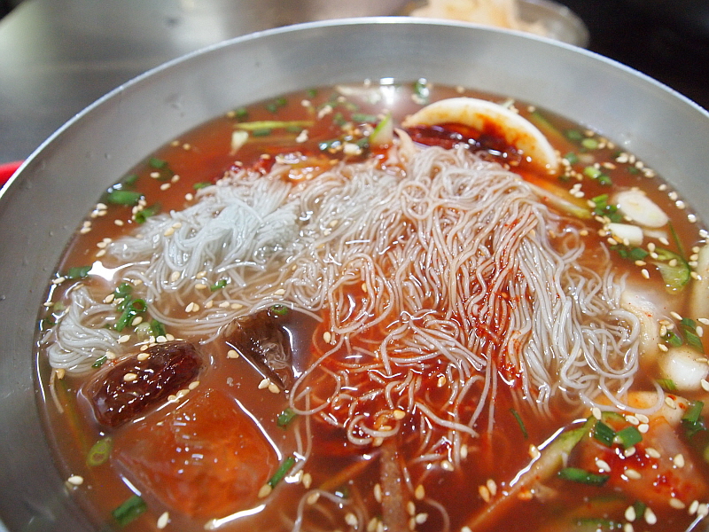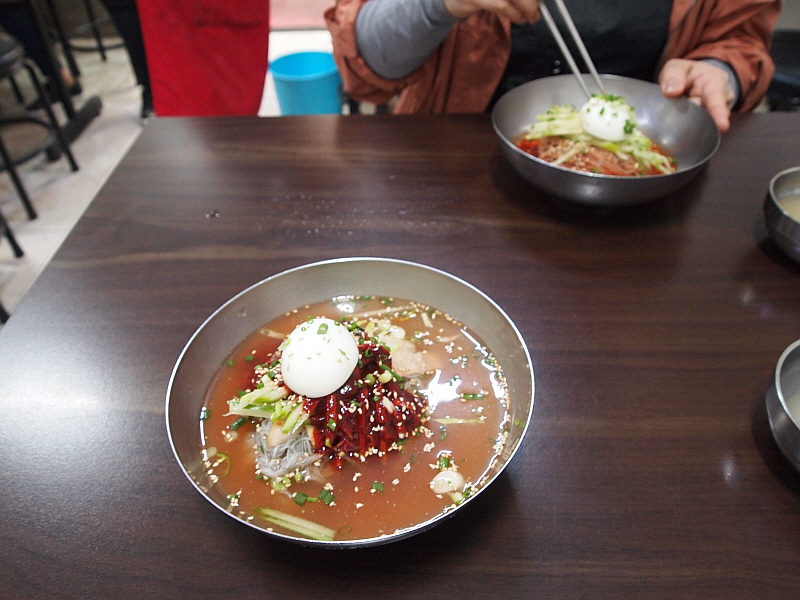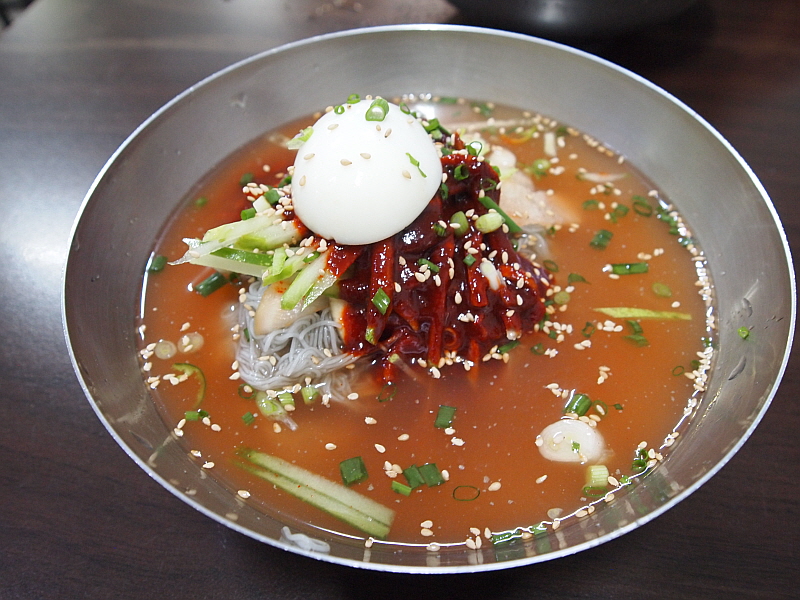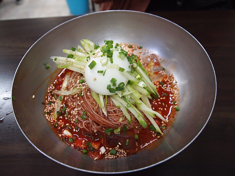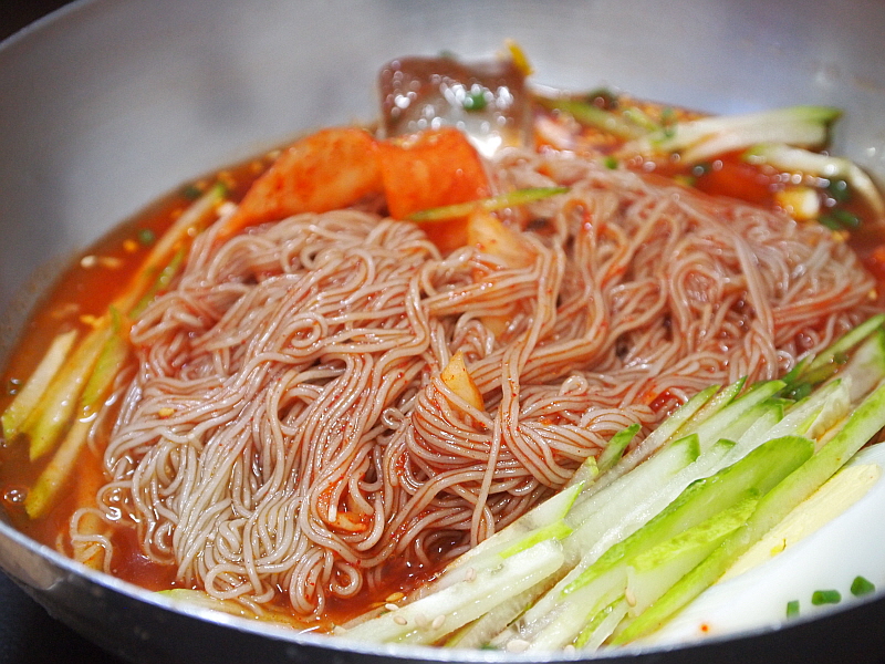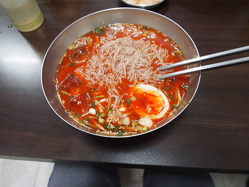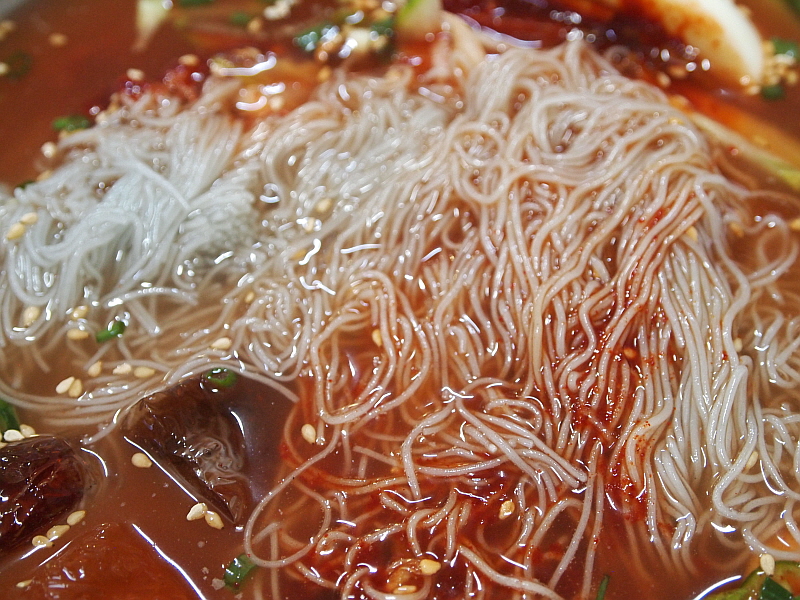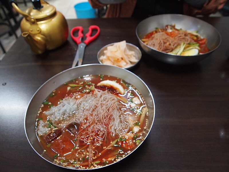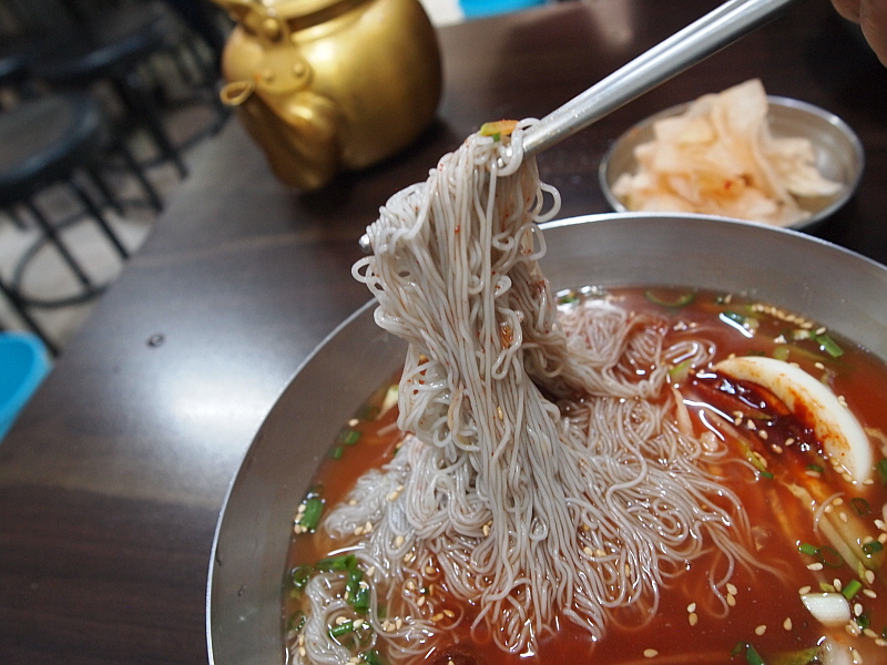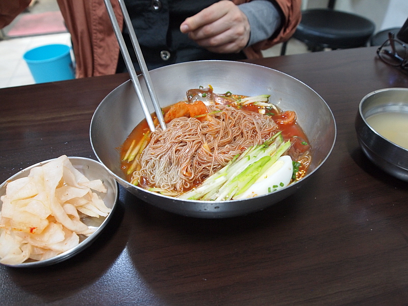 그렇게 약간의 기다림을 통해 만난 이집의 냉면은 그 면발이 장난이 아니었다. 아주 가느다란 면발에 툭툭 끊어지는 메밀 특유의 특성을 가지고 있었으며, 내촌면의 장원 막국수처럼 메밀의 향이 진하게 났다. 장원막국수는 100% 메밀로 면을 만든다지만 여긴 그런 것 같지는 않았고, 밀가루든 고구마가루든 뭔가 들어 가는 것 같은데 희안하게도 부드럽고, 야들야들하면서 식감이 좋았다. 면발에 관한한은 제일시장에서 내가 먹어 본 집 중에 으뜸이 아닌가 싶다. 다만 내가 주문한 물냉면은 글쎄 그런 면과 조합이 완벽하다고 하기엔 뭔가 좀 아쉬움이 있었다. 그렇지만 비빔냉면은 한결 맛이 좋았다. 그래서 내린 결론, 이곳에서 물냉면 보다 비빔냉면을 먹어야 한다.
