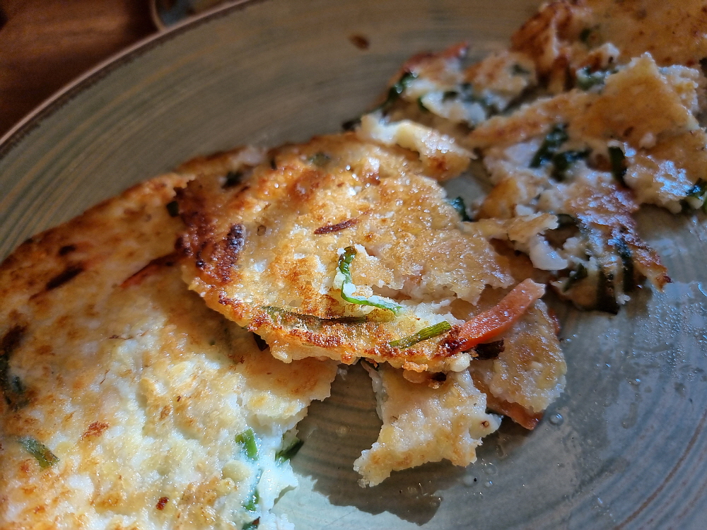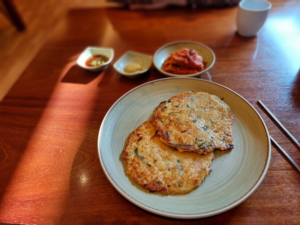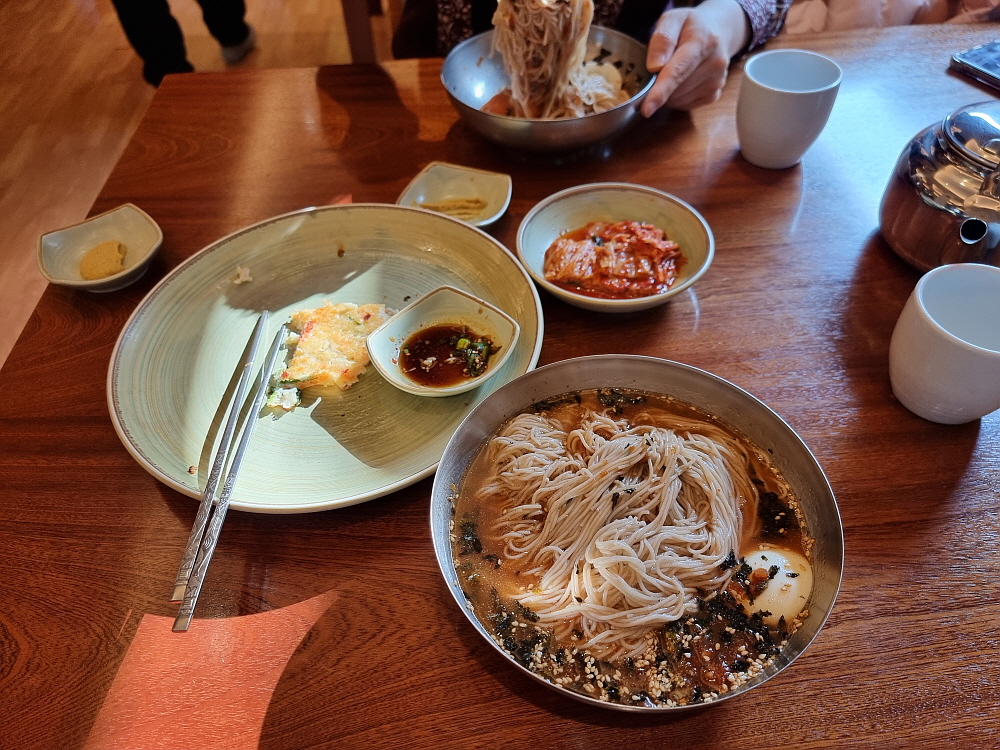 우리는 이날 특별히 녹두전도 추가했다. 유명 막국수집들은 거의 대부분 서브 메뉴도 대표적인 것들이 있다. 만두를 제대로 만들어 파는 곳도 있고, 도토리묵을 주는 곳도 있다. 또 메밀전이나 수육을 주력으로 미는 곳도 있다. 샘밭막국수의 서브메뉴는 두부와 녹두전이다. 초기부터 여긴 모두부와 녹두전을 아주 잘 만드는 것으로 유명했다. 그 중에 우리는 녹두전을 선택했는데 기름진 녹두전과 알싸하고 시원, 담백한 막국수가 정말 잘 어우러지기 때문이다. 녹두전 한 입과 막국수 한 젖가락을 번갈아 먹으면서 무한루프의 젖가락질을 하게 된다.