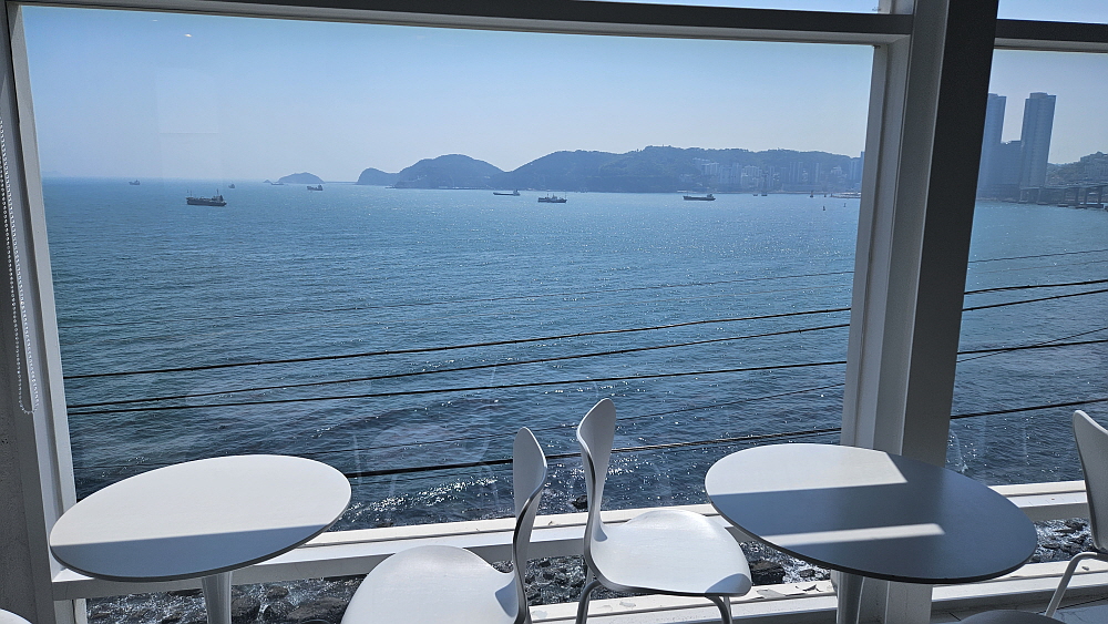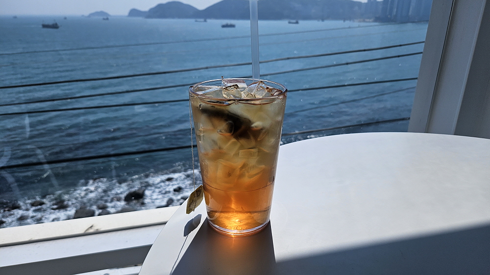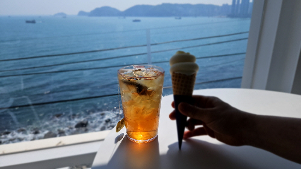 전날 다소 과하게 알콜과 만난 관계로 아메리카노가 부담스러워 얼그레이 홍차를 아이스로 주문하고 소프트 아이스크림도 주문했다. 사실 여긴 아이스크림이 전문인 곳이란다. 분위기가 그러니 커피도 팔지만 말이다. 사실 이런 분위기의 카페에서 맛이 어떠했다는 사족은 별 필요가 없다. 어차피 우린 좋은 기분에 분위기를 즐기기 위해 들어왔지 제대론 된 커피 한 잔 먹겠다는 생각은 없었기 때문이다. 하지만 아이스크림도 얼그레이티도 정말 좋았다. 아마도 좀 걷다가 만난 시원한 자리와 찬 음료였기 때문일 수도 있다. 하지만 시원한 차 한 잔 마시면서 바라보는 부산의 앞바다는 글쎄 다른 어떤 말도 필요없는 그냥 그 자체 바다다.