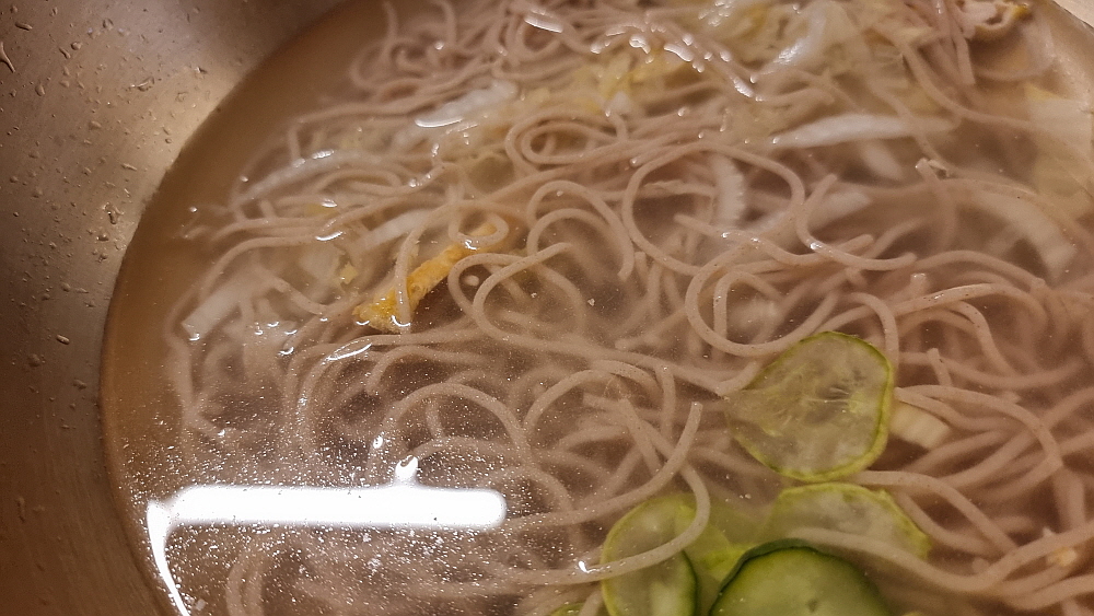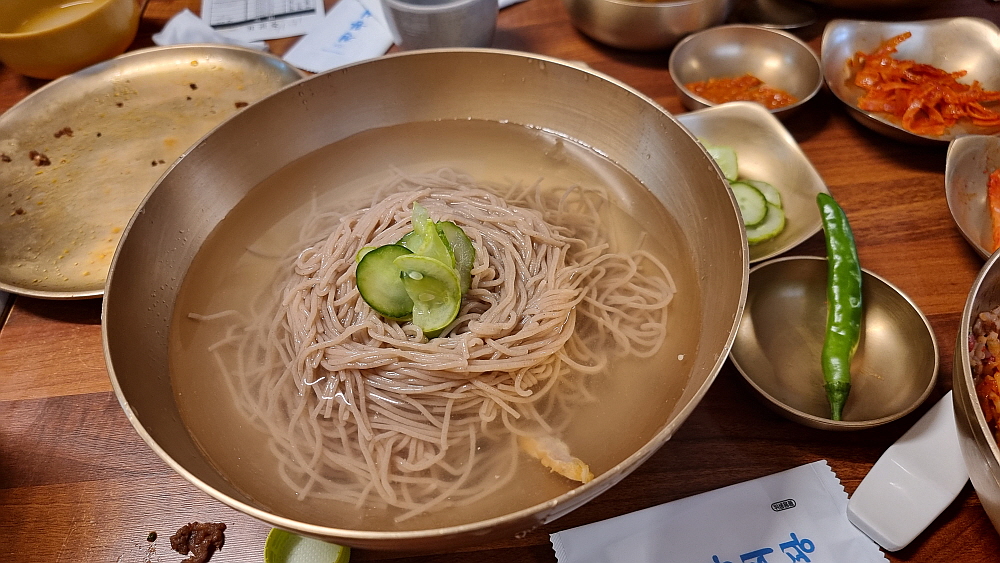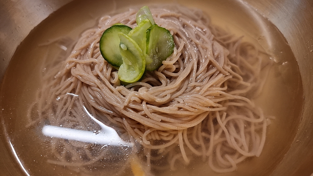 하지만 먹는 내내 뭔가 아쉬웠다. 그래도 진주에 왔는데 진주 냉면을 먹어봐야 하는 것 아닌가 싶었다. 비빔밥이 어느 정도 들어가니 더 그런 생각이 간절해졌다 그래서 메뉴를 둘러 보았는데 이집에도 냉면이 있다는 사실을 알게 되었다. 얼마나 반갑던지... 그래서 서둘러 물냉면을 주문했다. 진주 냉면은 사실 비빔냉면이 따로 있었는지 기억이 나지 않지만 아무튼 늘 물 냉면으로 먹었던 것 같다. 비빔밥과 막걸리의 조화도 좋지만 이런 의외의 주문도 참 매력적인 일이다. 그렇게 조금 기다리고 있다니 드디어 진주에서의 물냉면이 나왔다.