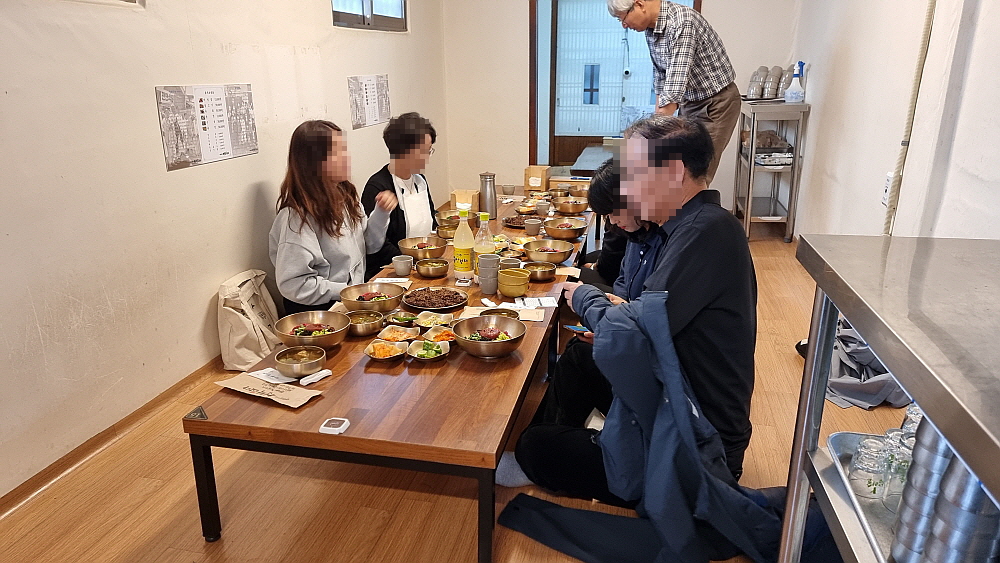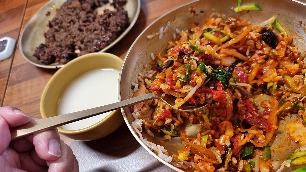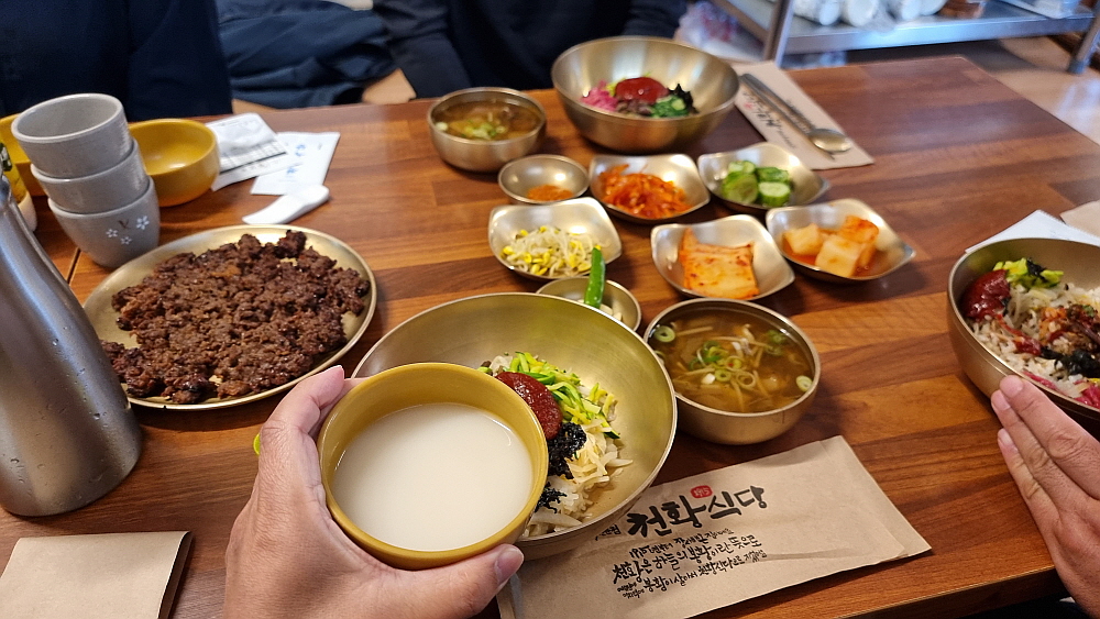 좋은 안주가 나왔으니 현지에서 파는 막걸리 하나 안 먹을 수가 없었다. 역시 맛난 음식의 완성은 향기로운 술이다. 김치가 맛이 좋아 두 어 번인가 리필을 했다. 어릴적 먹었던 김장김치의 정겨운 맛이 진하게 나는 김치였다. 사실 막걸리는 이 김치만 있어도 얼마든지 마실 수 있긴 하다. 비빔밥의 맛은 자극적이지 않은 자연스러운 것이었다. 육회 비빔밥인데도 고기 맛이 강하게 나지 않고 야채를 넣은 비빔밥처럼 자연스럽게 고기와 밥이 어우러지는 그런 비빔밥이었다. 그리고 자극적이지 않은 또 하나의 명품 선지해장국도 참 구수하니 비빔밥과의 조화가 잘 되는 궁합이었다.