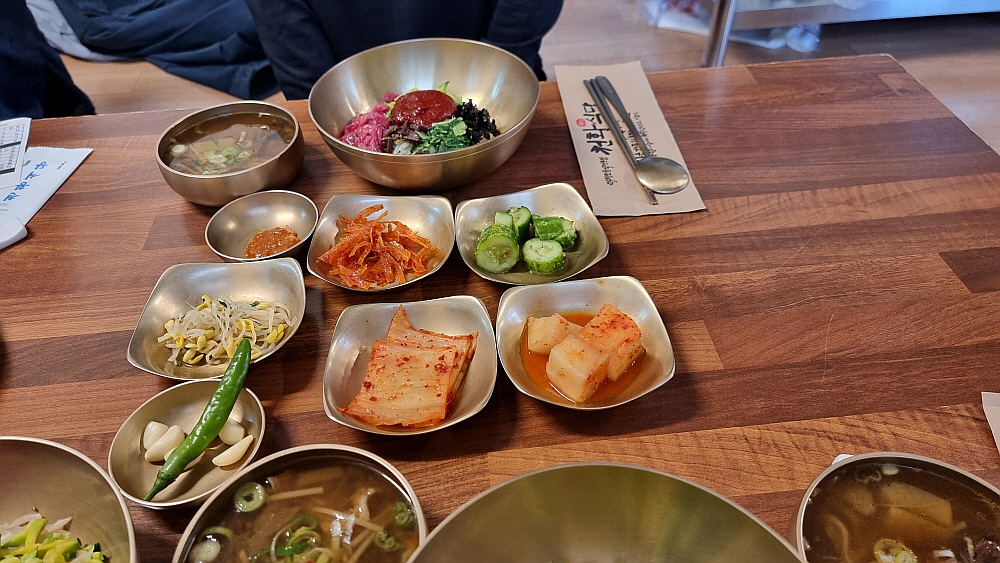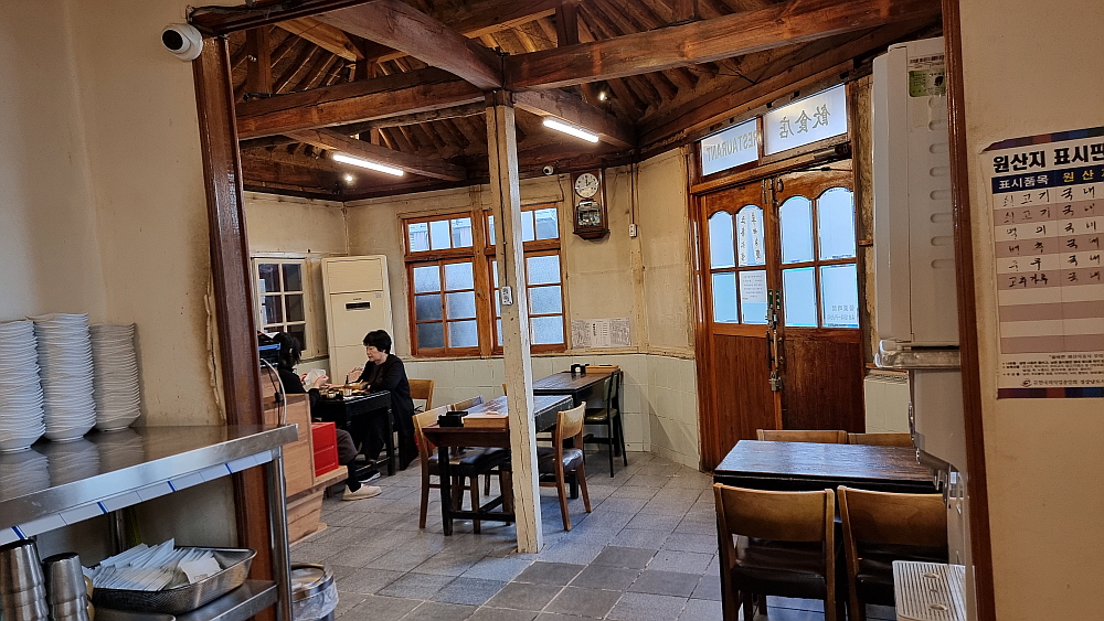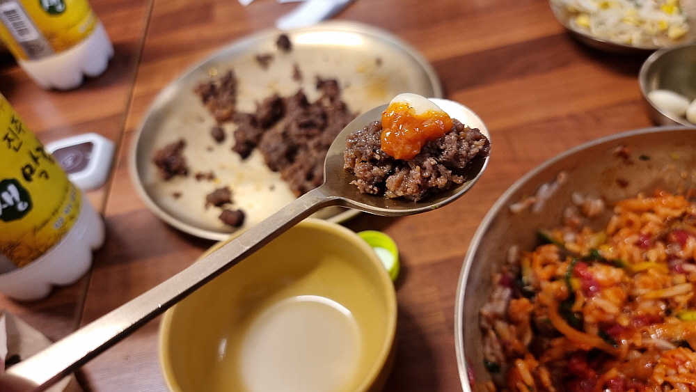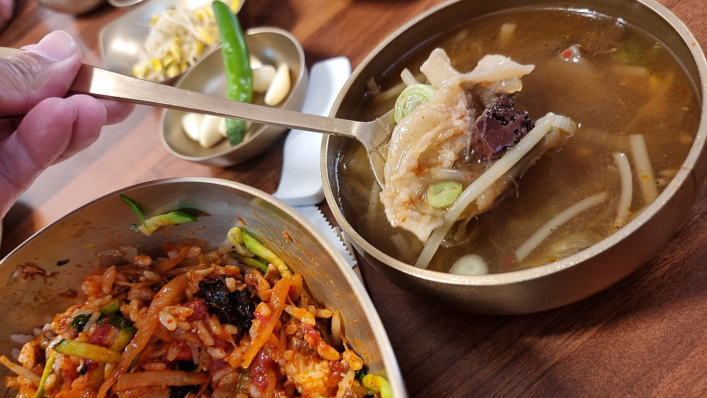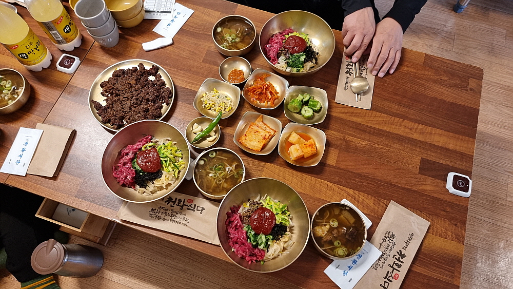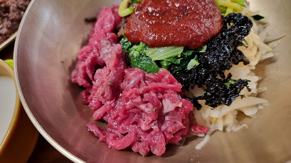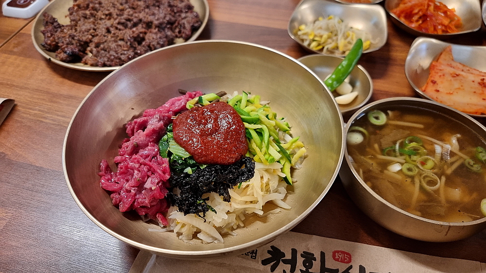 물론 이곳이 비빔밥만 파는 식당은 아니었다. 하지만 워낙 유명하다는 진주비빔밥에 다들 기대가 커서 다른 음식을 먹는다는 사람은 없었다. 그리고 또 하나 유명한 것이 불고기였는데 마치 언양불고기처럼 바싹 구워 내어주는 것이 특징이었다. 비빔밥의 가격은 싼 편이 아니다. 왜냐하면 소고기 육회가 들어간 육회 비빔밥이기 때문이다. 거기에 국으로 선지해장국을 준다. 이것도 특이한 것이다. 1957년인가에 오픈을 한 집이니 벌써 70년 가까이 영업을 한 아주 오래된 식당이다. 처음부터 이렇게 비빔밥을 팔았다고 하니 정말 세월의 힘이 느껴지는 음식이라 하겠다.