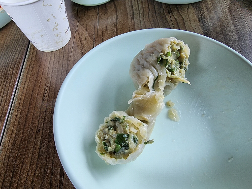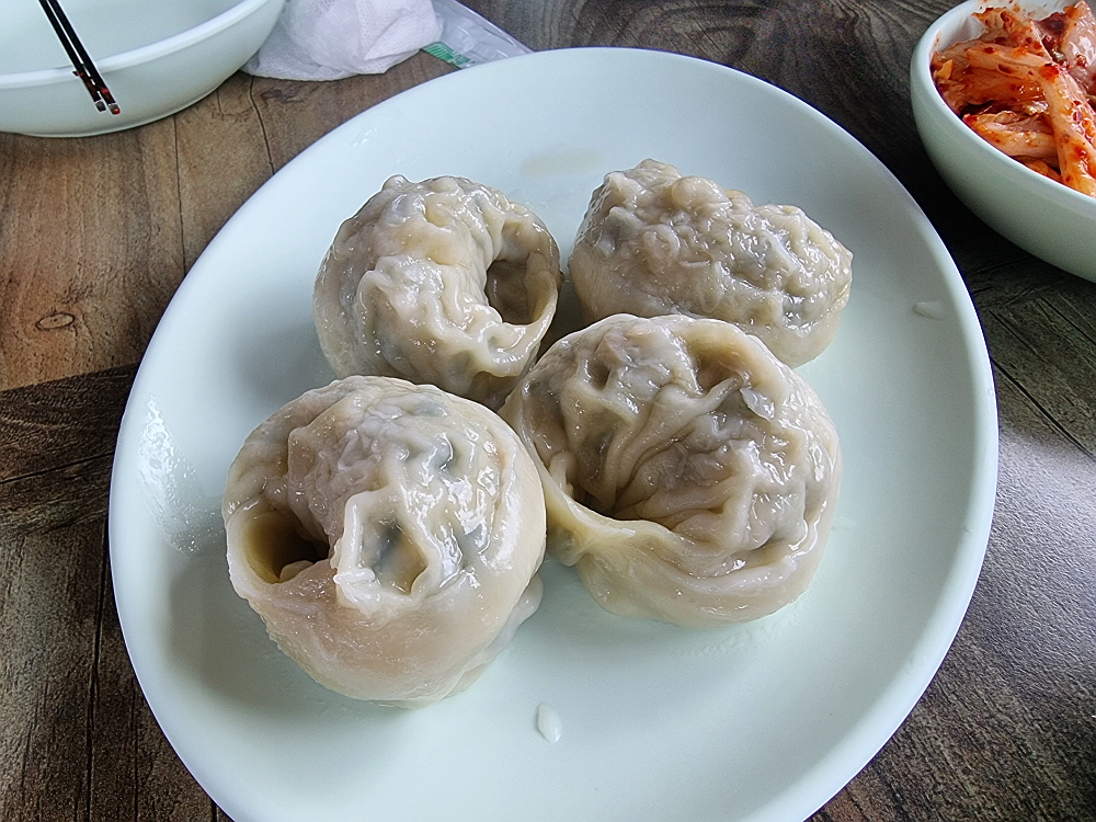 만두가 먼저 나왔다. 공장만두처럼 생겼는데 여기서 만든단다. 과연 그럴까? 너무 일률적인 모양인데 말이야... 하지만 한 입 먹어보니 여기서 직접 만드는 만두 같다는 생각이 강하게 들었다. 만두라는 음식이 주는 묘한 흥분과 맛이 있는데 공장 만두는 너무 인위적인 맛이라 그런 기분이 들지 않는다. 하지만 여기 만두는 묘한 매력이 있었다. 커다란 크기와 튼실하게 들어간 속이 그야말로 만두의 전형적인 맛이었다. 이런 만두는 두 개만 먹어도 배가 불러 올 수 있다.