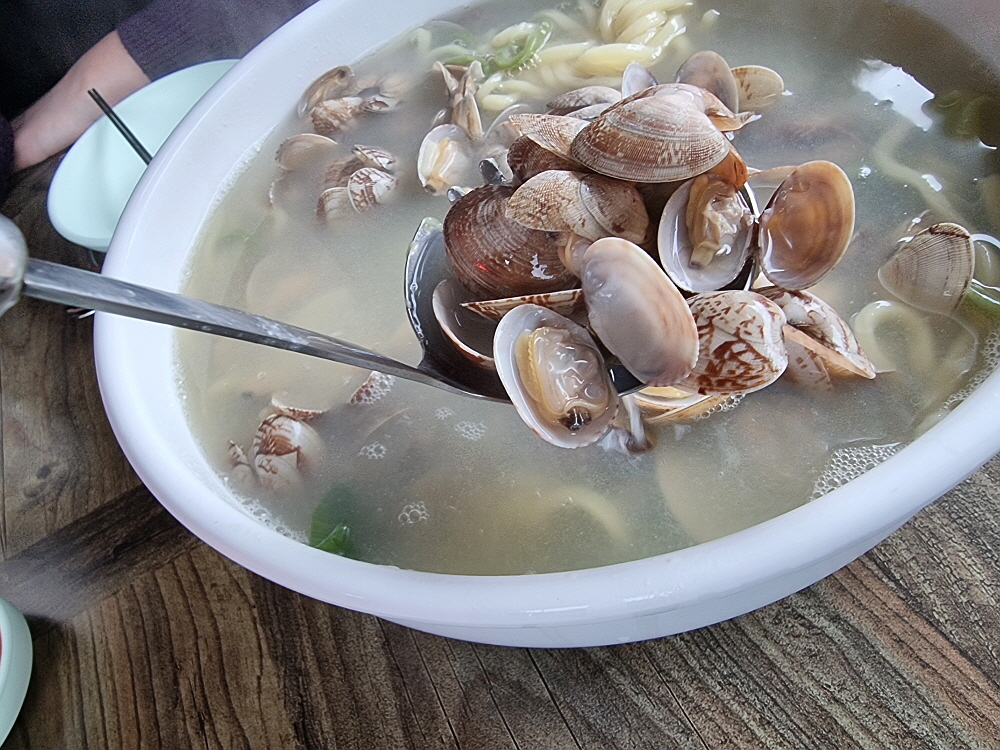 1층과 2층으로 나뉘어 있는 홀 중에서 1층은 완전 만석이었고, 그래도 2층은 좀 여유가 있었다. 여긴 바지락 칼국수와 만두 밖에 메뉴가 없단다. 다른 선택지는 없었다. 그래도 우린 둘다 주문했다. 다른 바지락 칼국수 집들처럼 여기도 주문을 받은 다음에 면을 뽑는 방식인지 나오는데 시간이 좀 걸렸다. 아무튼 그렇게 오랫만에 만나 서로 못한 이야기도 하고, 밖의 경치도 보면서 휴일 오후 시간을 만끽하고 있었다. 이런 맛에 친척들을 만나는 것이지...