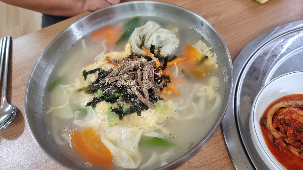 칼국수와 만두 칼국수의 가격 차이는 천 원이다. 만두 칼국수는 정말 만두가 딱 하나 더 들어 있었다. 조금 피식하고 웃음이 나왔다. 메뉴 이름 그대로 만두가 떡 하니 하나 들어간 칼국수였기 때문이다. 참 직관적이네... 드디어 대망의 국물을 먹어 보았다. 비주얼만 봐서는 디포리나 멸치, 황태 같은 어물류로 만든 국물 같았다. 그런데 막상 먹어보니 '아~ 이게 뭔 재료로 만든거지?' 싶은 생각이 들었다. 참 묘한 맛이었다. 분명 어패류가 들어간 것은 맞지만 뭔가 다른 이질적인 재료도 분명 들어간 맛이 나기 때문이다. 참 신기한 국물 맛이었다. 이런 국물을 다른 곳에서 먹어본 적 없는거 같은데...