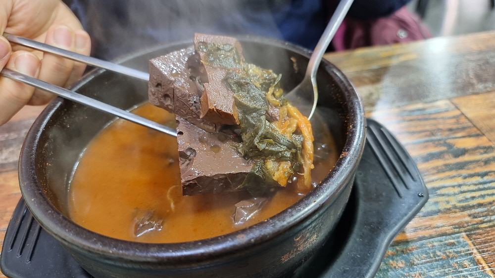 설렁탕에는 값에 비해 꽤나 많은 고기 건더기가 들어 있었다. 정말 튼실한 구성이다. 동해시에 올 때마다 느끼는 것인데 물가가 좀 다른 지역에 비해 싸다는 생각이다. 이 가격에 이렇게 푸짐한 국밥을 만나기가 다른 지역에선 쉽지 않다. 물론 대전이나 군산도 물가가 싸다고 느끼기는 했지만 말이다. 선지해장국의 선지도 신선한 것이라 맛이 고소하고 좋았다. 신선한 선지의 맛은 다른 것으로 대체하기가 어렵다. 별 것 아닌 식재료라 할 수도 있지만 서민들에게 영양과 맛을 선사해주는 고마운 존재다. 선지와 우거지만 있으면 완성되는 선지해장국도 참 자주 먹었던 해장국이다.