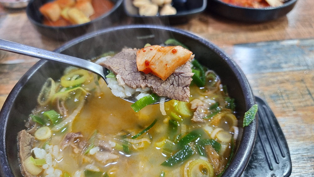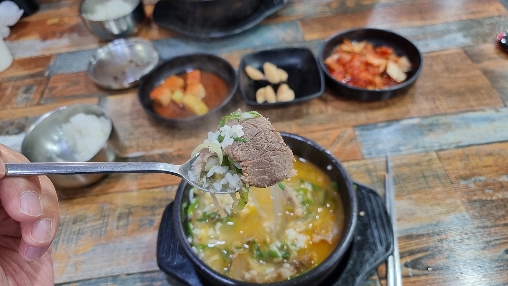 지역이 동해시인데 식당이름이 경성이라 좀 이상하긴 했지만 들어가보니 포스가 느껴지는 집이었다. 우리는 선지해장국과 한우설렁탕을 주문했다. 아침부터 매운 국물은 자신이 없었기에 맑은 국물이 뭐냐고 물어보고 주문했다. 9시도 안 된 이른 시간이라 그런지 손님은 한 팀 정도만 있었다. 그런데 그 팀은 그 시간에 소주를 마시고 있었다. 강적들이다. 해장을 하러 왔다가 국물이 너무 좋아 다시 술을 시작했을까? 아무리 술을 좋아하는 사람이라도 이 시간은 범접하기 어려운 법인데 대단하다. 잠시 기다리니 우리의 음식이 나왔다. 설렁탕은 우리가 흔히 아는 바로 뽀얀 국물의 국밥이다.