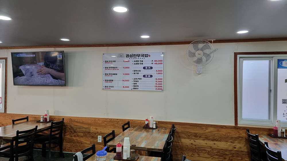 전날 엄청 과음을 한 것은 아니지만 그래도 아침은 챙겨 먹어야겠기에 숙소 근처에 갈만한 해장국집이 있는지 검색을 했다. 그러다 여기다 싶은 집을 찾아 갔는데 그곳은 옛날식으로 만든 좌식의 식당이었다. 아침부터 쭈그리고 앉는 것이 싫어 그냥 나오고 말았다. 숙박업소가 엄청 많은 동해시의 유명한 관광지이니 분명 갈만한 집이 있을 것이라 생각하고 차를 타고 동네를 돌았다. 그러다 이집을 발견했다. 비록 체인점이긴 하지만 뭔가 모를 포스가 느껴지는 소고기국밥집이었다. 이름은 경성한우국밥이라는 곳이다. 근처에 다른 선지해장국 집도 있었지만 이집이 더 끌려서 여기로 갔다.