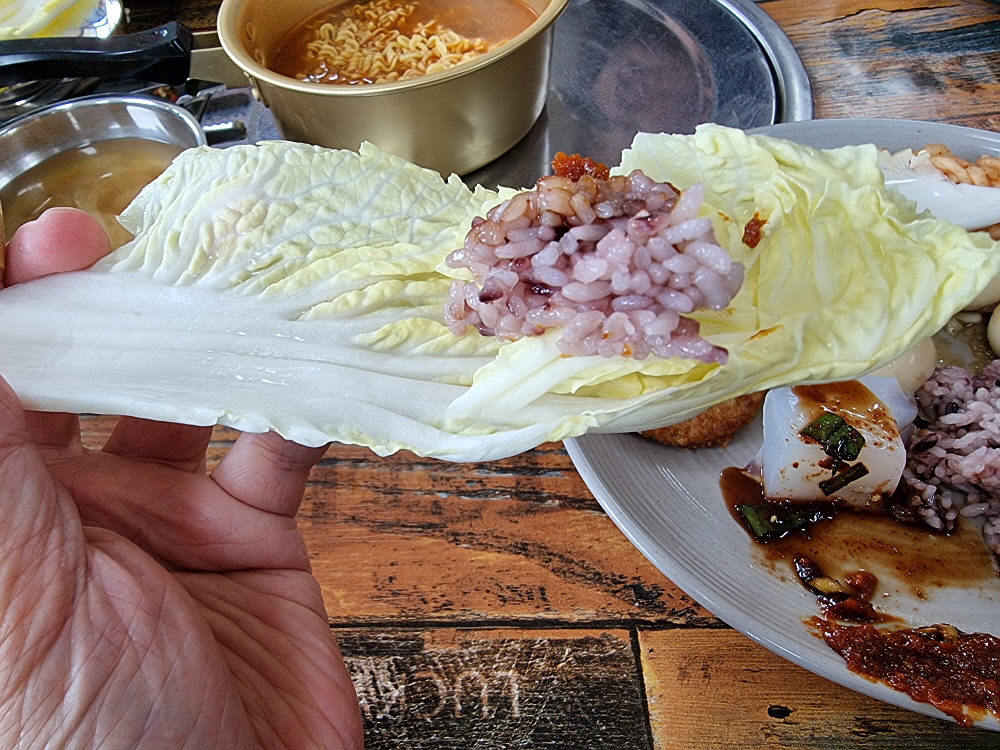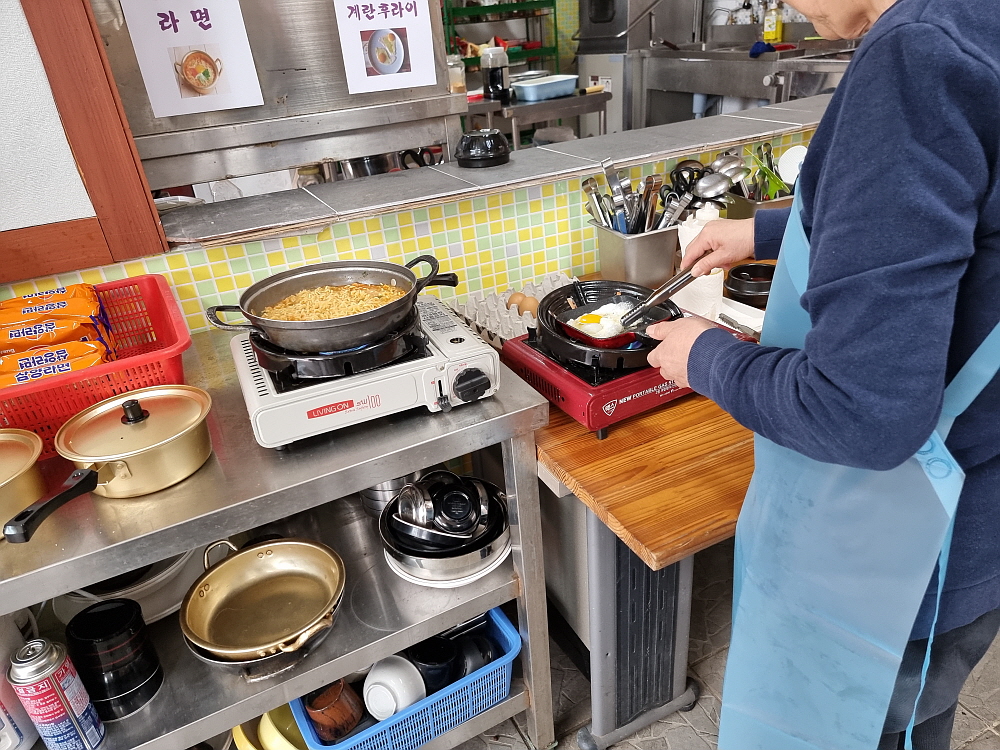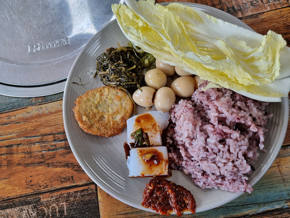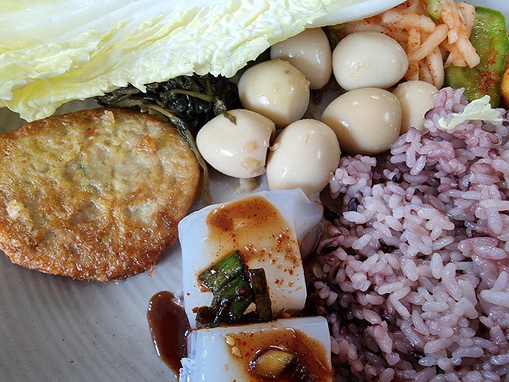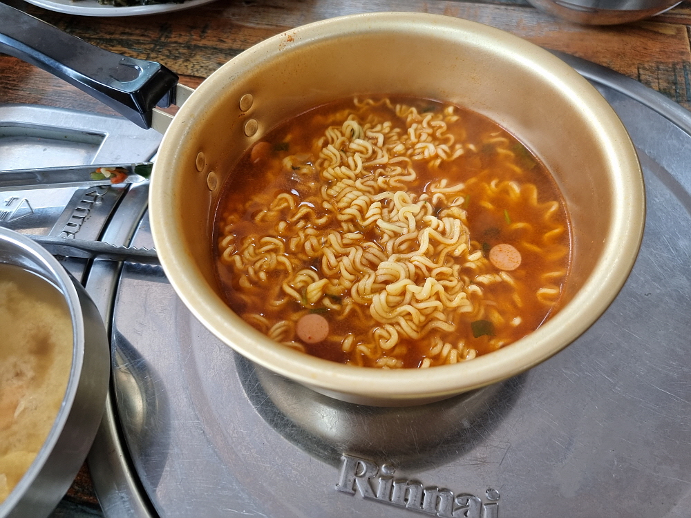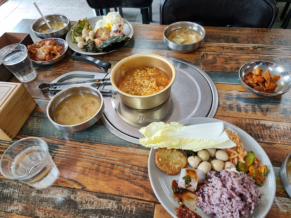예전 추어탕집의 인테리어에서 크게 바뀐 것은 없었다. 하지만 뭔가 깔끔해진 느낌도 있었다. 가게 입구부터 한식부페라는 식당 이미지와 맞게 여러 반찬들이 보였다. 한식부페라고는 하지만 그냥 집에서 맘편하게 먹는 그런 느낌의 식당이었다. 라면은 손님이 알아서 끓여 먹는 방식인데 몇 개를 먹던지 알아서 하는 것이다. 라면 옆에는 계란이 있는데 이것도 후라이를 몇 개 먹든 손님이 알아서 하는 것이다. 양 많은 사람들에겐 혜자스러운 집이다. 그리고 그 옆엔 쌀밥, 흑미밥, 잡곡밥 등이 있다. 그리고 기본 찬들이 있다. 영락없이 늘 먹던 익숙하고, 편안한 반찬들이다.