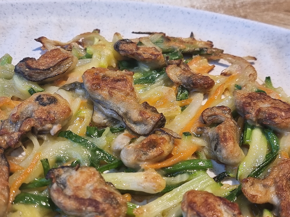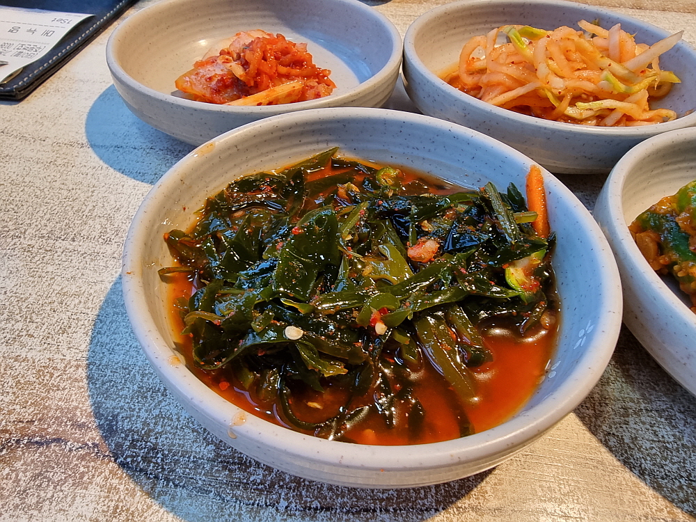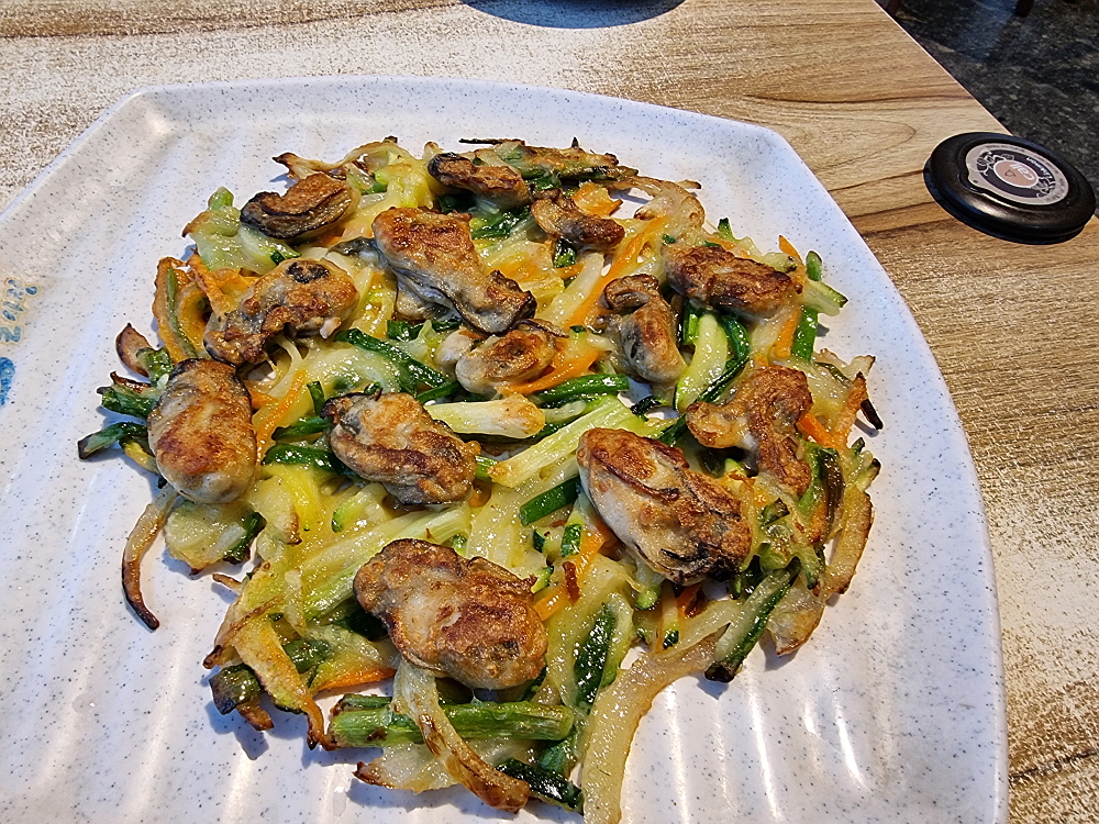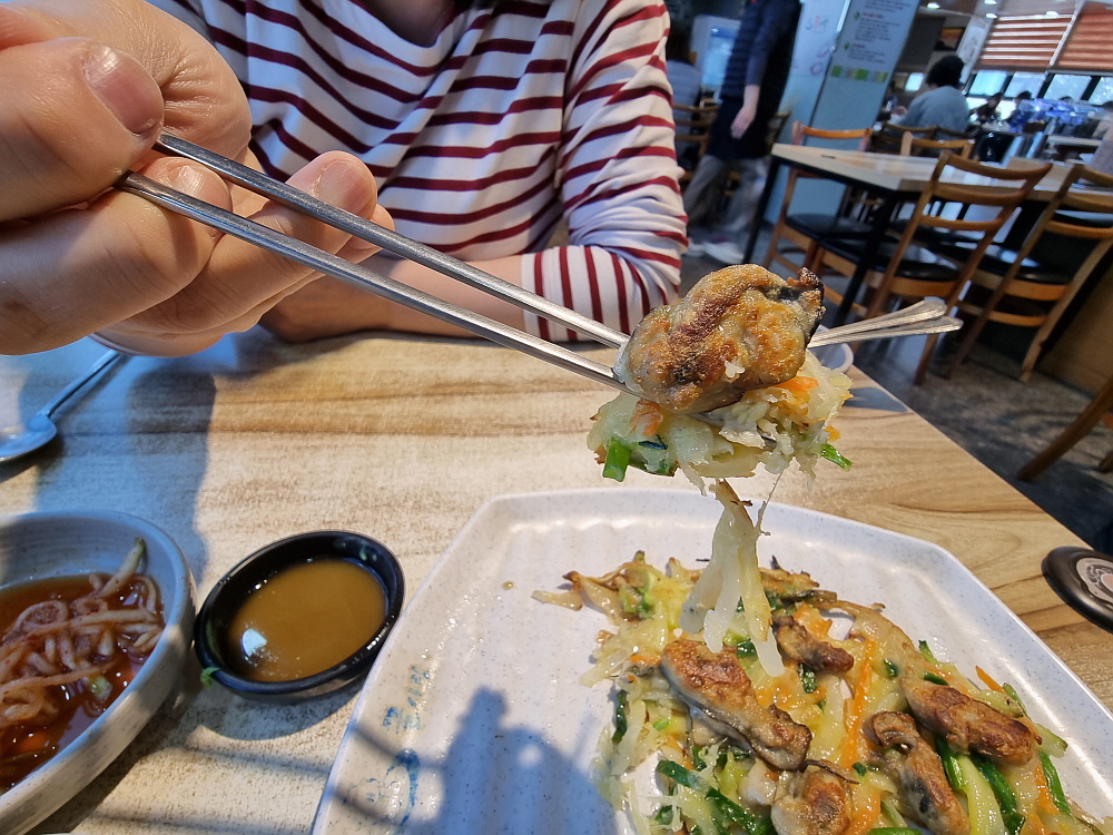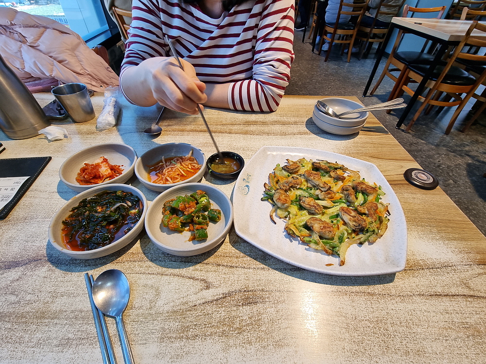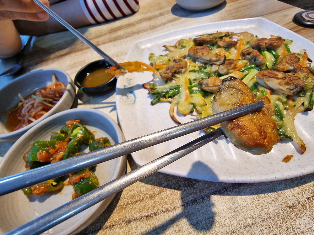 반찬을 셀프로 리필할 수 있는데 무채나물이 어찌나 시원하고 맛나던지 네 번이나 가져다 먹었다. 별 것 아닌 것 같지만 고추 된장무침도 좋았다. 가성비 좋은 굴전이지만 굴은 정말 푸짐하게 들었다. 이런 구성이라면 만 원을 받아도 될 것 같은 비주얼이었다. 이래서 점심 시간에 그렇게 손님이 많았는가 보다. 운전만 아니라면 여기서 울산 막걸리 한 잔 딱 마시면 금상첨화 같은데 말이다. 고소하고 기름진 굴해물전은 에피타이저로도 아주 훌륭했다.