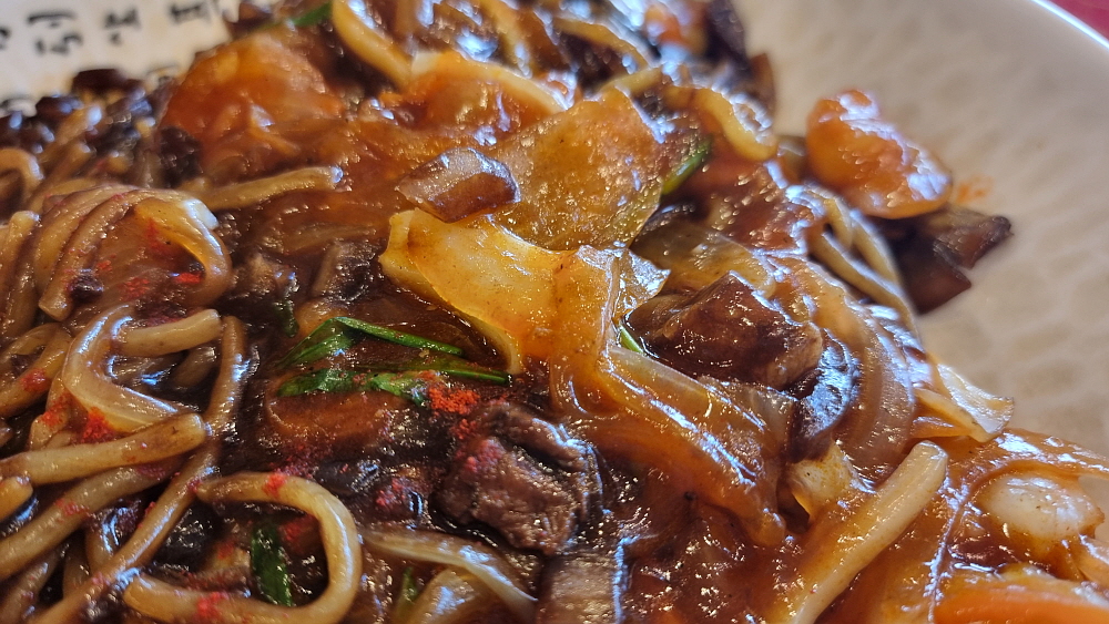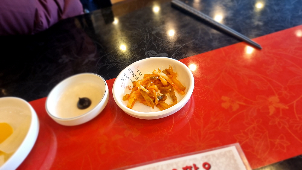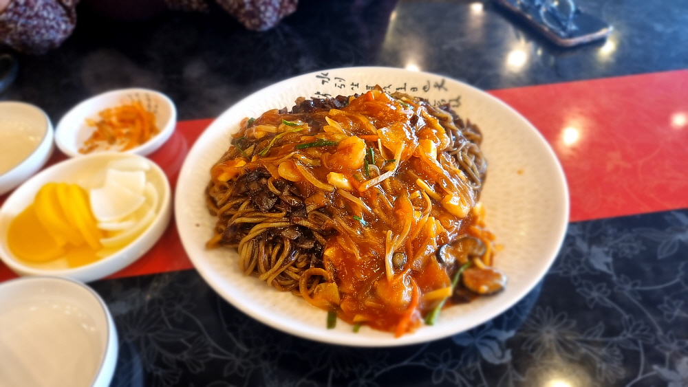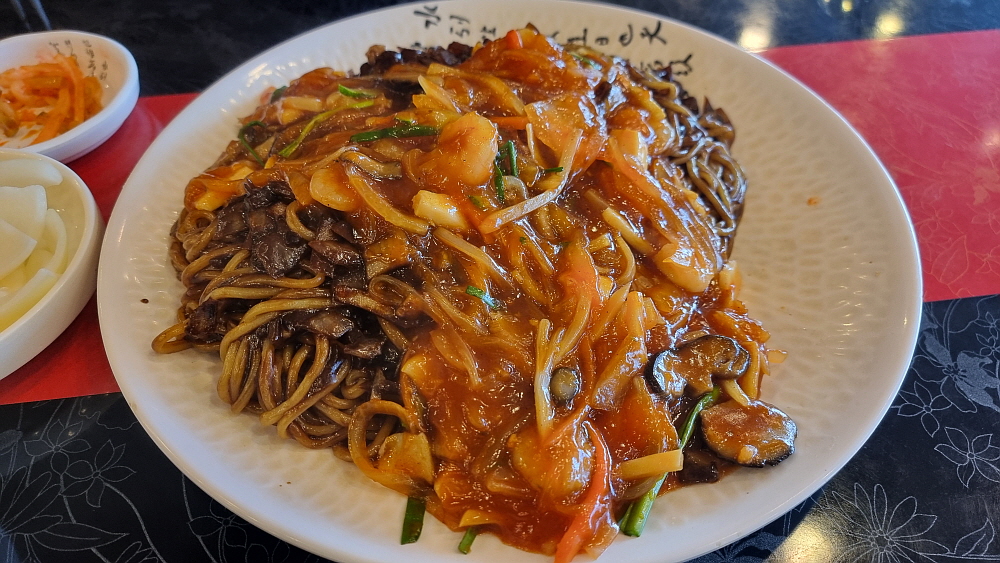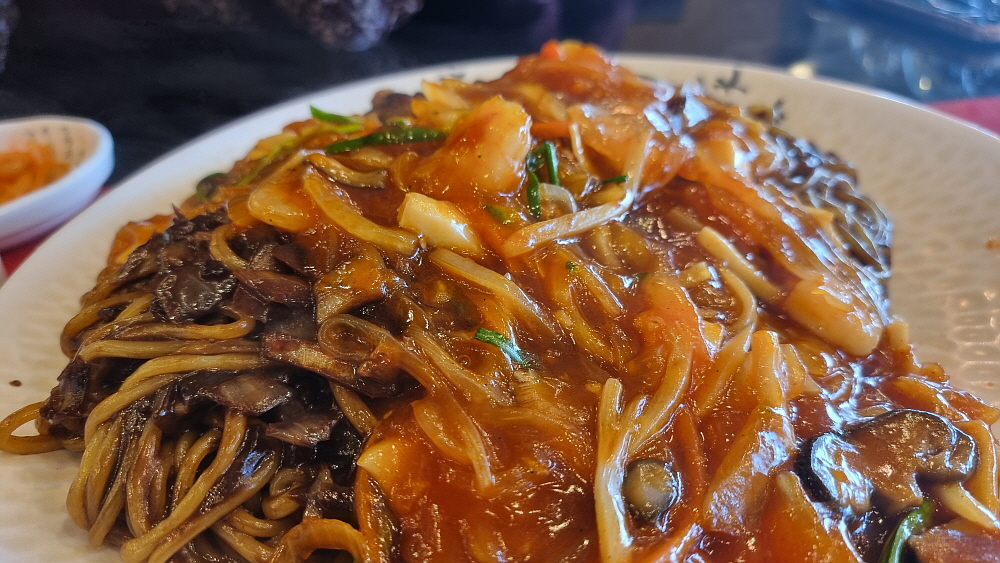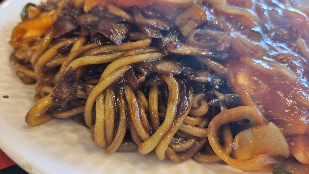 손님들이 단무지나 양파를 맘껏 가져다 먹을 수 있는 방식이 좋았다. 눈치 보지 않고 실컷 먹을 수 있어 우리도 세 번인가를 다녀왔다. 그런데 조금 기다린 후 만난 쟁반짜장은 좀 이상한 비주얼이었다. 짜장소스가 잘 비벼진 면 위에 다른 이질적인 소스가 하나 더 부어져 있었다. 이건 뭐지? 짬뽕도 아니고, 짜장도 아닌 말 그대로 첨 보는 비주얼이었다. 맛을 보니 유산슬이나 팔보채 같은 요리에 쓰이는 소스 같았다. 이걸 왜 짜장면 위에 뿌려 놓은 것일까? 아마도 이런 방식이 안양식인가 보다. 예전에 TV에서 전라도 어느 지역은 짜장과 짬뽕을 한 번에 먹을 수 있는 특별한 면이 있다는 것을 본적이 있는데 그것과 비슷한 컨셉인 모양이다.