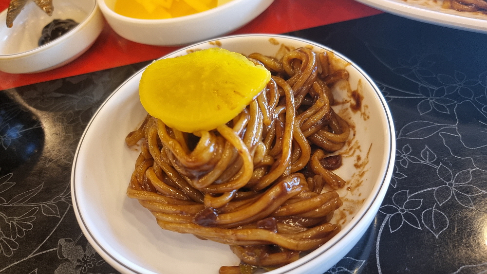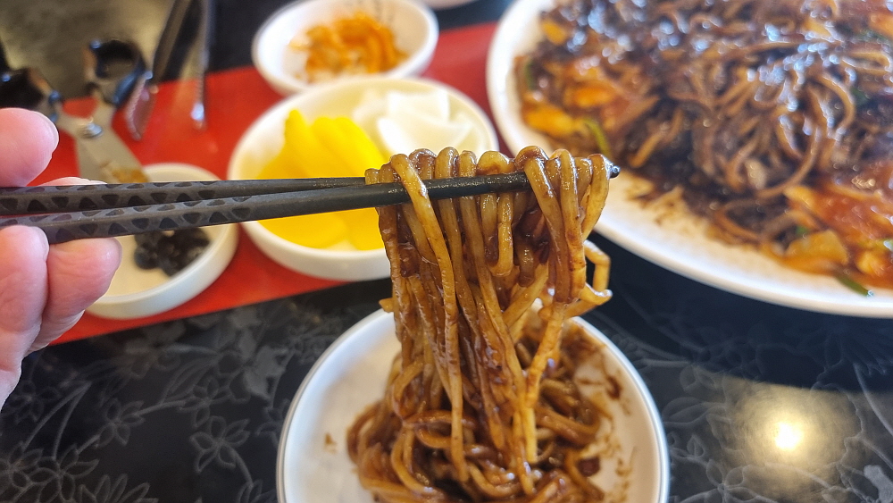 손님들이 단무지나 양파를 맘껏 가져다 먹을 수 있는 방식이 좋았다. 눈치 보지 않고 실컷 먹을 수 있어 우리도 세 번인가를 다녀왔다. 그런데 조금 기다린 후 만난 쟁반짜장은 좀 이상한 비주얼이었다. 짜장소스가 잘 비벼진 면 위에 다른 이질적인 소스가 하나 더 부어져 있었다. 이건 뭐지? 짬뽕도 아니고, 짜장도 아닌 말 그대로 첨 보는 비주얼이었다. 맛을 보니 유산슬이나 팔보채 같은 요리에 쓰이는 소스 같았다. 이걸 왜 짜장면 위에 뿌려 놓은 것일까? 아마도 이런 방식이 안양식인가 보다. 예전에 TV에서 전라도 어느 지역은 짜장과 짬뽕을 한 번에 먹을 수 있는 특별한 면이 있다는 것을 본적이 있는데 그것과 비슷한 컨셉인 모양이다.