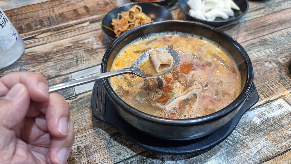 그런데 내장탕 국물을 한 숟가락 먹어보니 엄청 자극이었다. 이건 맵질인 사람은 먹기가 조금 힘든 국물이었다. 건더기에는 그렇게나 좋아하는 소곱창도 있었는데 눈물을 머금고 함께 간 일행에게 내장탕은 넘겨야했다. 국물이 조금만 덜 매웠더라면 참 좋았을텐데... 하지만 생각해 보면 내장은 거의 이렇게 매운 국물이었던 것 같다. 이집은 대부분의 음식들이 국물이 들어가는 것이었는데 그래서인지 몰라도 국물의 맛은 비슷했다. 매운 것과 덜 매운 것만 빼면 말이다. 옆 테이블을 슬쩍 보니 수육을 먹는 손님들이 많았다. 여기가 어쩌면 수육도 맛집일 수 있다. 결국 고기 국물은 고기를 수육으로 만든 결과니까 말이다.