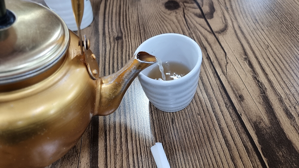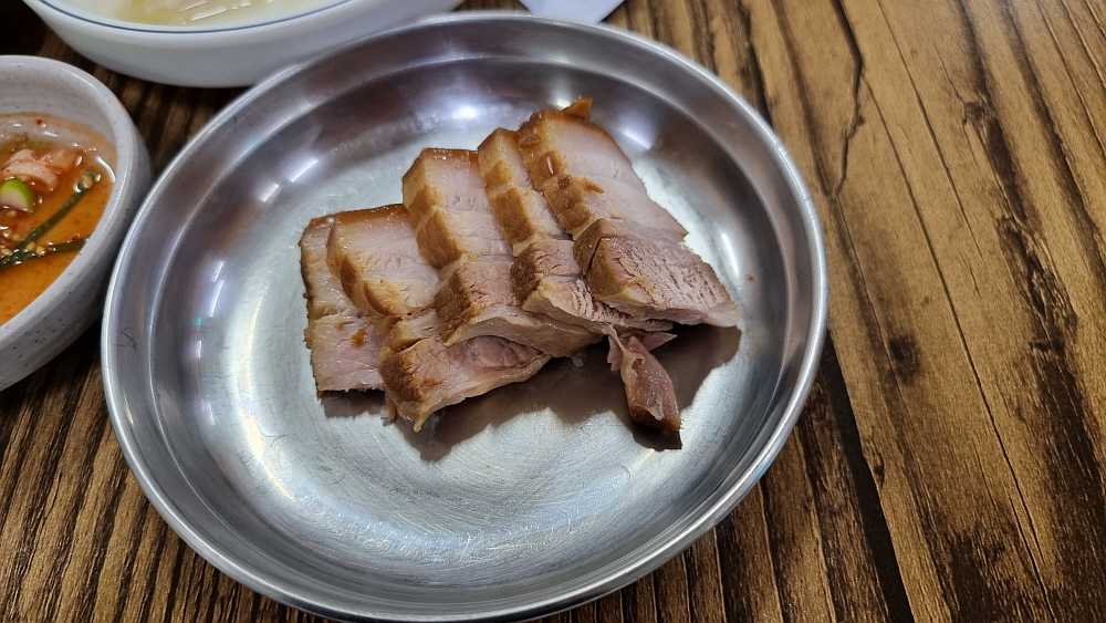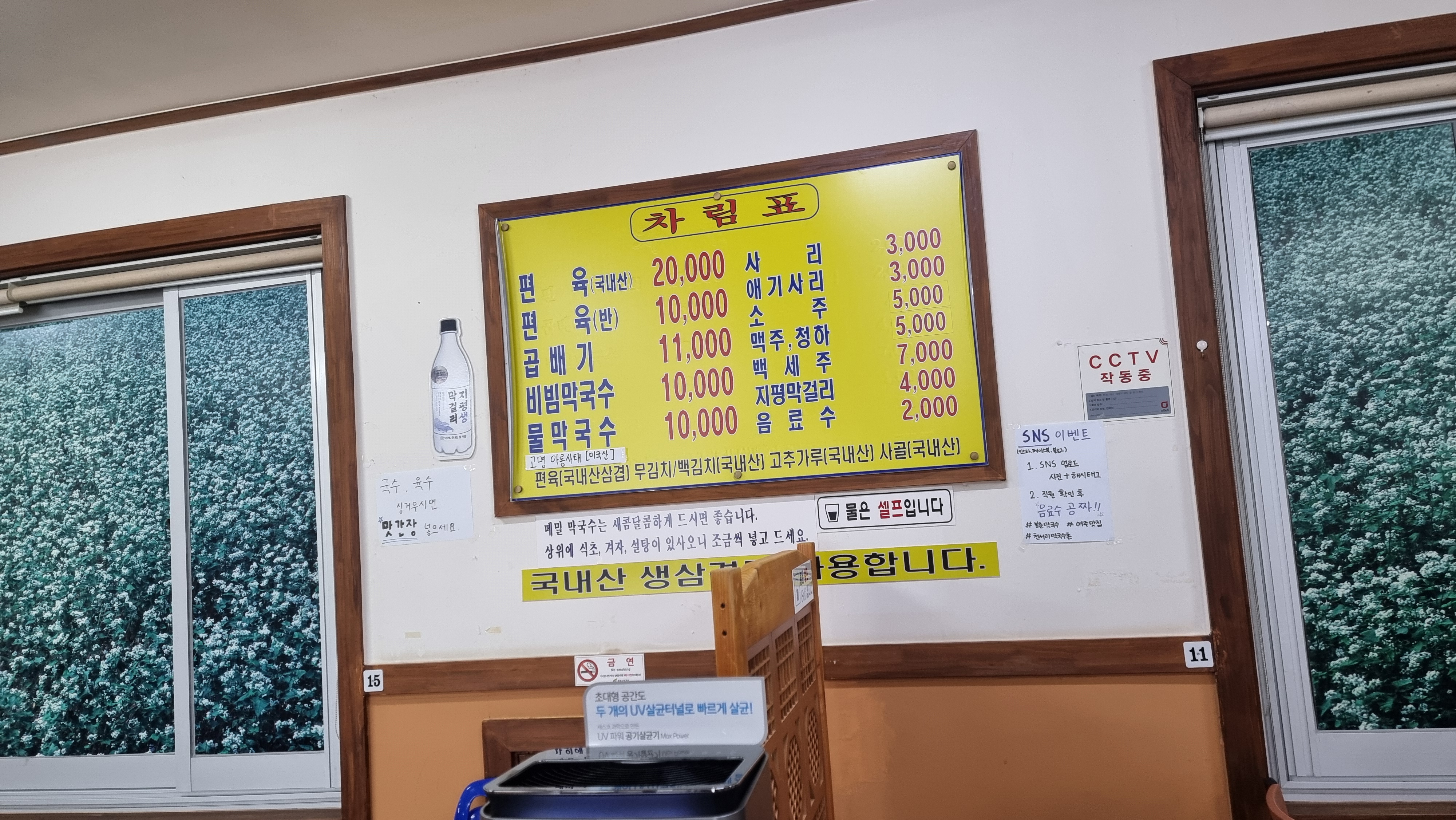 그런 심정으로 들어갔다. 당연히 물과 비빔막국수를 하나씩 주문했다. 작은 사이즈의 편육이 10,000원이라서 주문을 할까 말까 망설이고 있었는데 다행인지 행운인지 이집은 막국수만 주문해도 편육을 다섯 개 정도 서비스로 준다. 솔직히 양이 많지 않기 때문에 주문해도 다 먹지 못할지도 모르는데 이렇게 맛보기를 준다면 이보다 더한 고마움은 없을 것이다. 가게 벽면에는 싱거울 경우 맛간장을 넣어 먹으라고 써 있다. 아마 손님들 테이블에 있는 간장을 지칭하는 말인가 보다. 그리고 뜨거운 엽차 같은 것을 주는데 당연히 면수인줄 알았더니 고기 육수였다. 냉면집에서나 보던 그 육수말이다.
