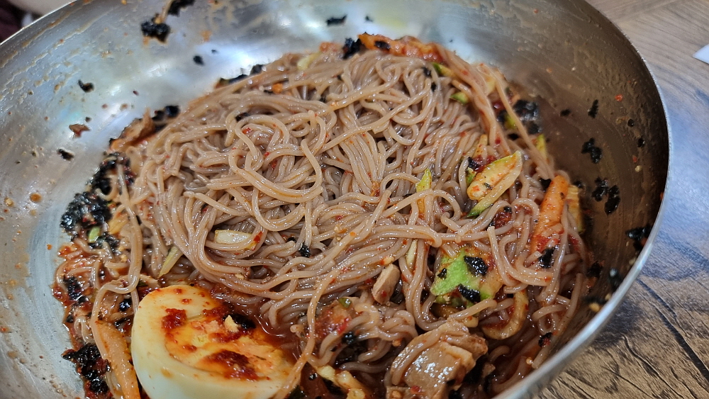 비주얼만 보면 물막국수나 비빔막국수나 강렬한 양념의 맛이 느껴질 것 같다. 그런데 막상 먹으면 전혀 아니다. 가게 벽에 붙어 있는 문구처럼 싱겁다는 생각이 들 정도다. 분명 고추가루 왕창인데 어찌 이리 담백하고 자극적이지 않을까? 신기할 정도로 슴슴한 맛에 놀라게 된다. 물막국수의 국물은 뭐랄까 평양냉면의 그것과 비슷했다. 깊은 맛이 느껴지지만 처음 먹을 때는 적응이 쉽지 않아 보이는 그런 맛이다. 내공이 느껴지지만 옆에 있는 양념과 설탕, 겨자 같이 자극적인 무엇인가를 넣어야 할 것은 그런 맛이기도 하다.