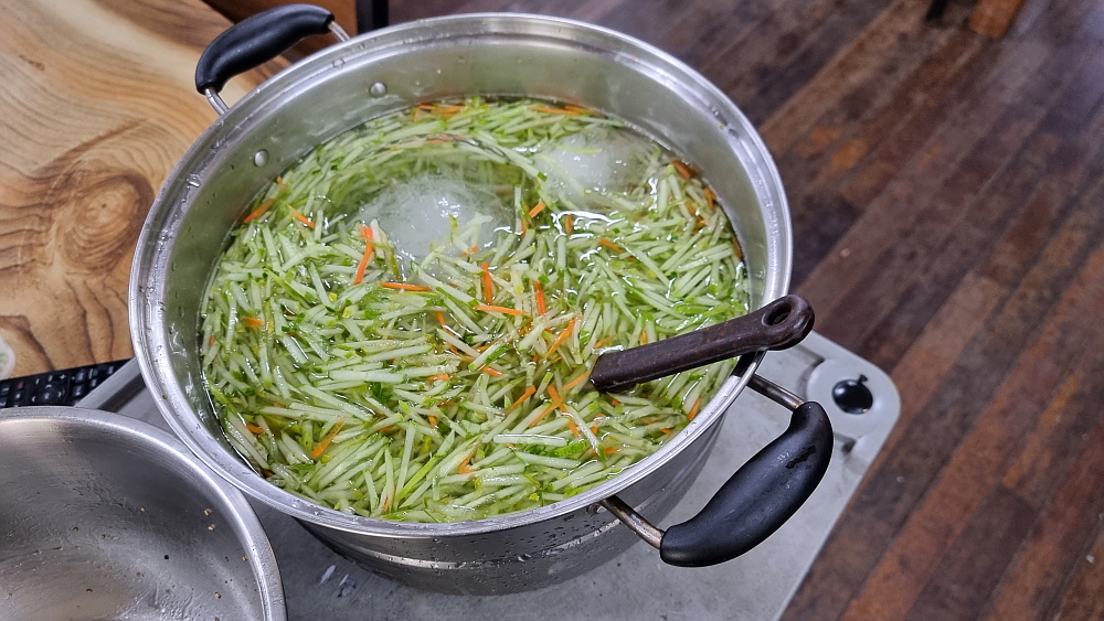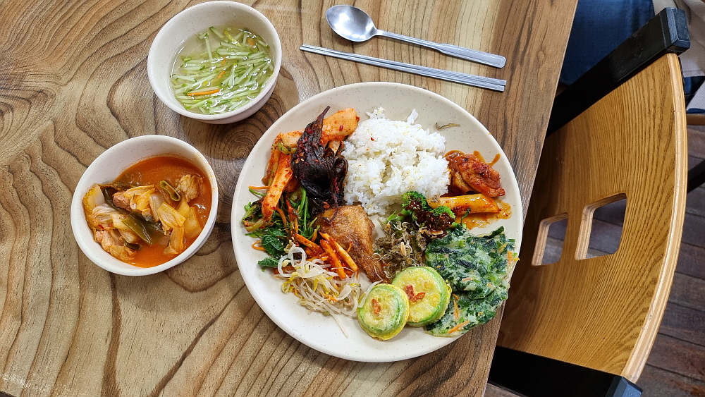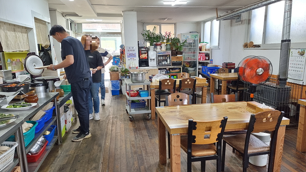원래 식당을 하던 곳은 아니었던 것 같은 실내의 모습이었다. 다소 어수선한 느낌도 있지만 정갈한 반찬들이 정말 많았다. 특히 눈에 띈 것은 번데기 볶음이었다. 술안주로나 먹던 번데기가 반찬으로 나오다니 이것도 참 신기한 일이다. 개인적으로 총각김치를 좋아하기 때문에 짠 줄 알면서도 많이 담았다. 전체적으로 반찬 구성이 집밥 같이 자연스럽고 맛깔스런 것들이었다. 이날의 특별 국물은 오이냉국이었다. 요즘처럼 더운 날에 정말 잘 어울리는 한 그릇의 국이라 하겠다. 페이스 조절을 하지 못하면 분명 과식으로 연결되거나 음식을 남기게 되는 사태가 발생할 수 있는 곳이다.