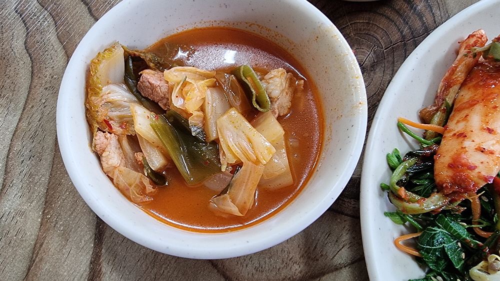 거기에 생선으로 튀기다시피 구운 가자미도 있었다. 그렇게 좋아하는 호박전도 보여 담았다. 결국 이런식으로 과식을 하게 되는 것이다. 반찬들이 너무 간이 세지도 않으면서 입에 착착 붙는 것이 정말 맛집이 맞았다. 요리도 재질과 재능으로 하는 것이라면 이집 주인장은 분명 대표급 능력을 가진 사람이라 하겠다. 돼지고기가 듬뿍 들어간 김치찌개는 평소에 너무나 즐겨 먹는 음식이다. 개인적으로 손님상 위에서 즉석떡볶이처럼 끓여 먹는 김치찌개보다 이렇게 오랜 시간 진득하게 끓여낸 김치찌개를 더 좋아한다. 김치의 맛이 온전히 국물에 온통 배어 있는 정말 진국인 것이다.