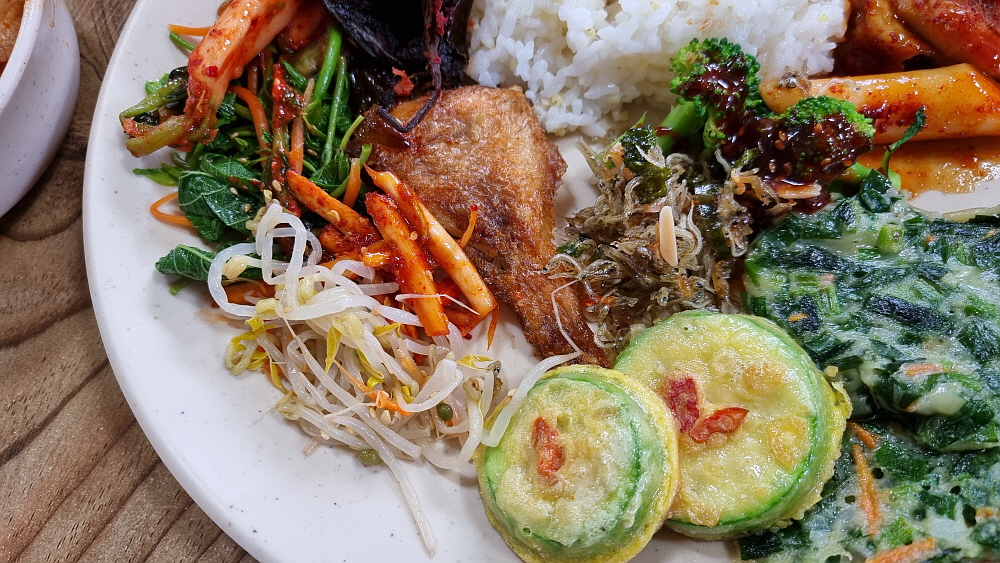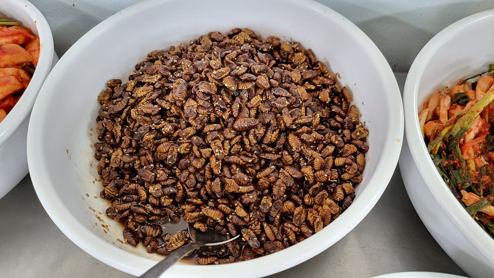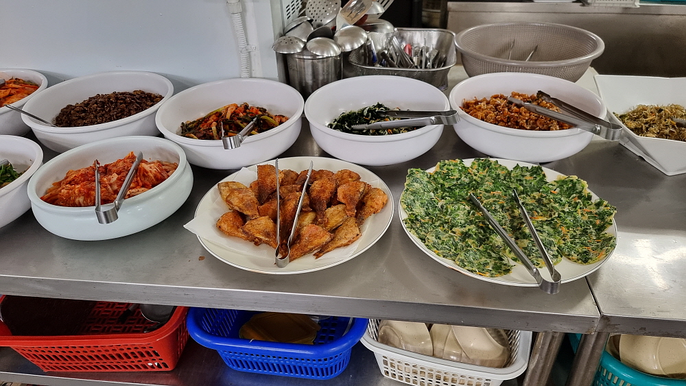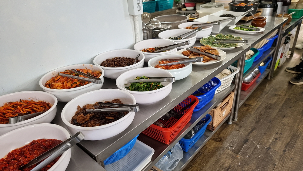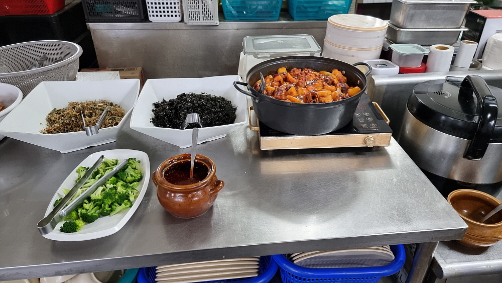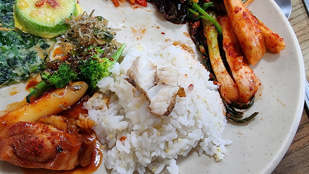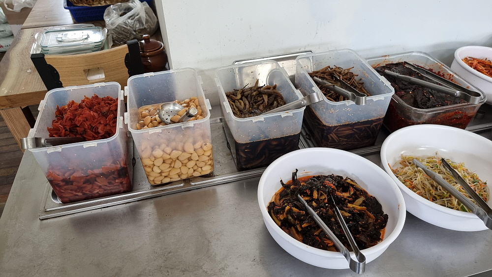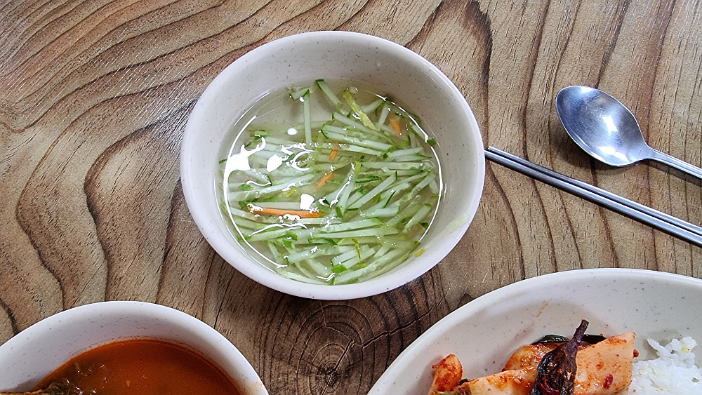 원래 식당을 하던 곳은 아니었던 것 같은 실내의 모습이었다. 다소 어수선한 느낌도 있지만 정갈한 반찬들이 정말 많았다. 특히 눈에 띈 것은 번데기 볶음이었다. 술안주로나 먹던 번데기가 반찬으로 나오다니 이것도 참 신기한 일이다. 개인적으로 총각김치를 좋아하기 때문에 짠 줄 알면서도 많이 담았다. 전체적으로 반찬 구성이 집밥 같이 자연스럽고 맛깔스런 것들이었다. 이날의 특별 국물은 오이냉국이었다. 요즘처럼 더운 날에 정말 잘 어울리는 한 그릇의 국이라 하겠다. 페이스 조절을 하지 못하면 분명 과식으로 연결되거나 음식을 남기게 되는 사태가 발생할 수 있는 곳이다.