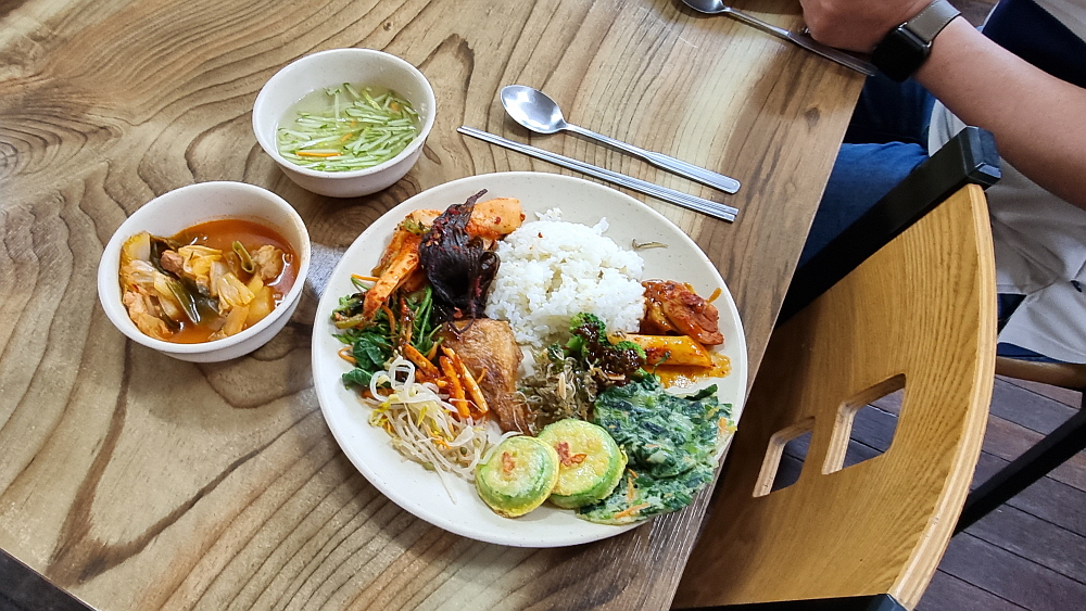 거기에 생선으로 튀기다시피 구운 가자미도 있었다. 그렇게 좋아하는 호박전도 보여 담았다. 결국 이런식으로 과식을 하게 되는 것이다. 반찬들이 너무 간이 세지도 않으면서 입에 착착 붙는 것이 정말 맛집이 맞았다. 요리도 재질과 재능으로 하는 것이라면 이집 주인장은 분명 대표급 능력을 가진 사람이라 하겠다. 돼지고기가 듬뿍 들어간 김치찌개는 평소에 너무나 즐겨 먹는 음식이다. 개인적으로 손님상 위에서 즉석떡볶이처럼 끓여 먹는 김치찌개보다 이렇게 오랜 시간 진득하게 끓여낸 김치찌개를 더 좋아한다. 김치의 맛이 온전히 국물에 온통 배어 있는 정말 진국인 것이다.