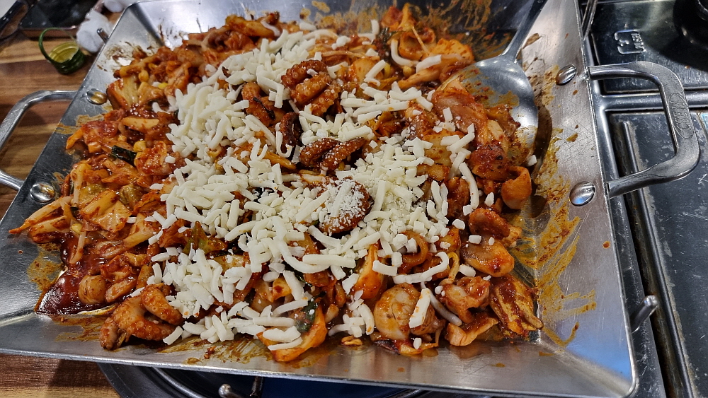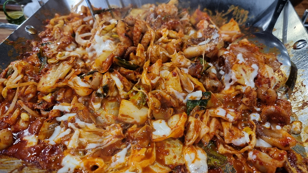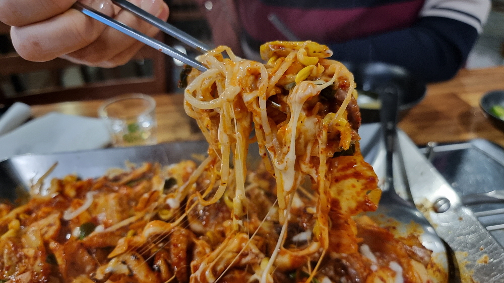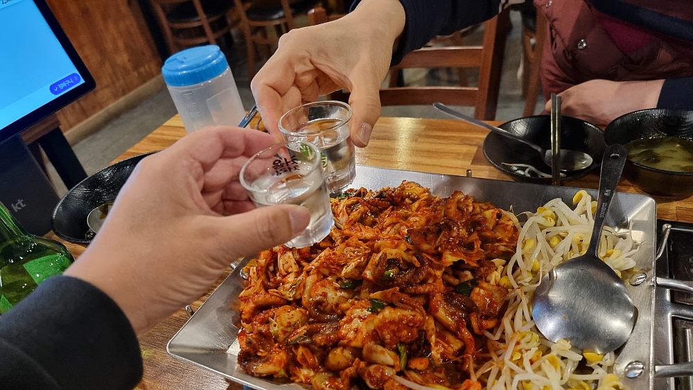 그런데 몇 점 먹지도 않았는데 빨간 경고등이 들어왔다. 역시 맵질에게 이런 화끈한 매운맛은 범접하기 어려운 영역인 모양이다. 이렇게나 날이 추운데도 땀이 어찌나 나던지... 우리는 콩나물로 중화가 되지 않는다는 생각에 치즈도 추가했다. 고소한 치즈가 들어가니 한결 나은 듯 했다. 매운 맛을 일부러 중화시켜 먹을 것이라면 그냥 안 매운맛을 주문할 것 그랬나 싶기도 하다. 그래도 소주와 잘 어울리는 쭈꾸미를 먹고 있노라니 이런 날엔 역시 매운 음식이라는 생각이다. 추운 날씨와 정면으로 승부해도 될 것은 기분이 되니 말이다.