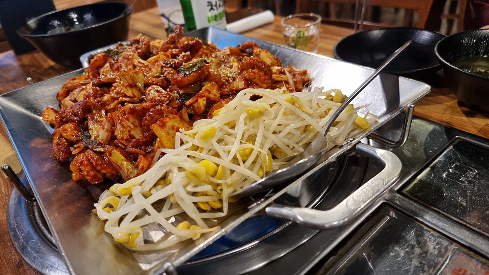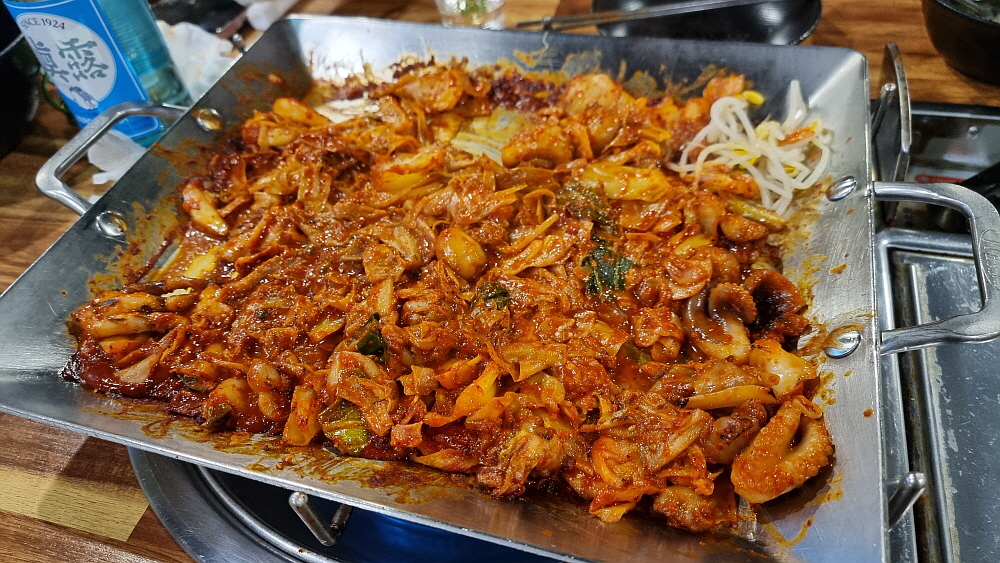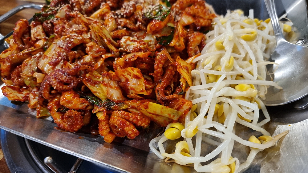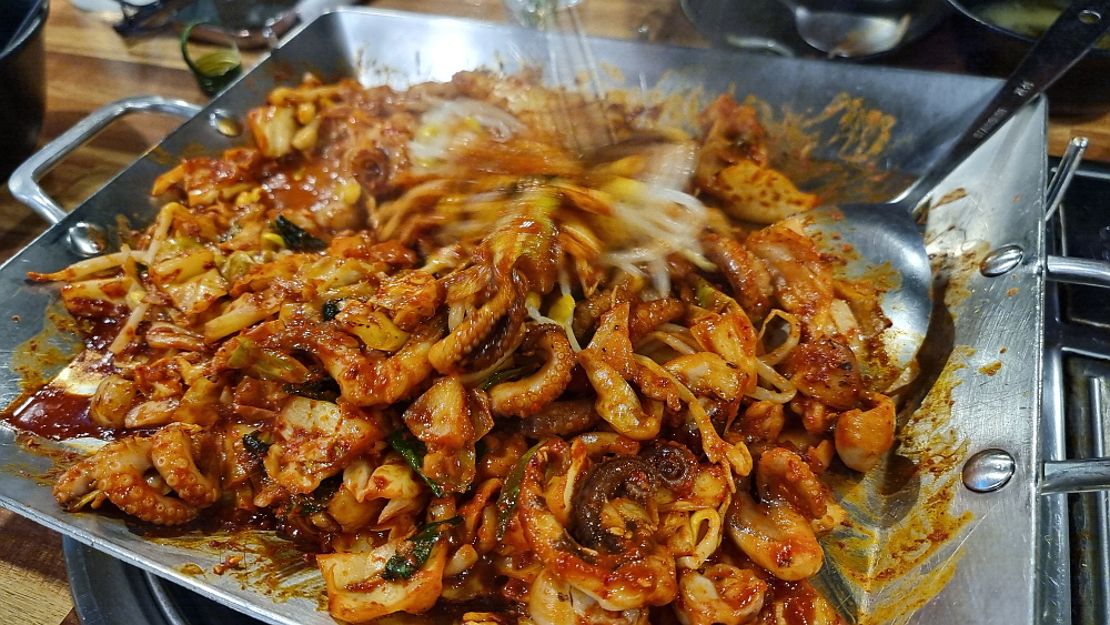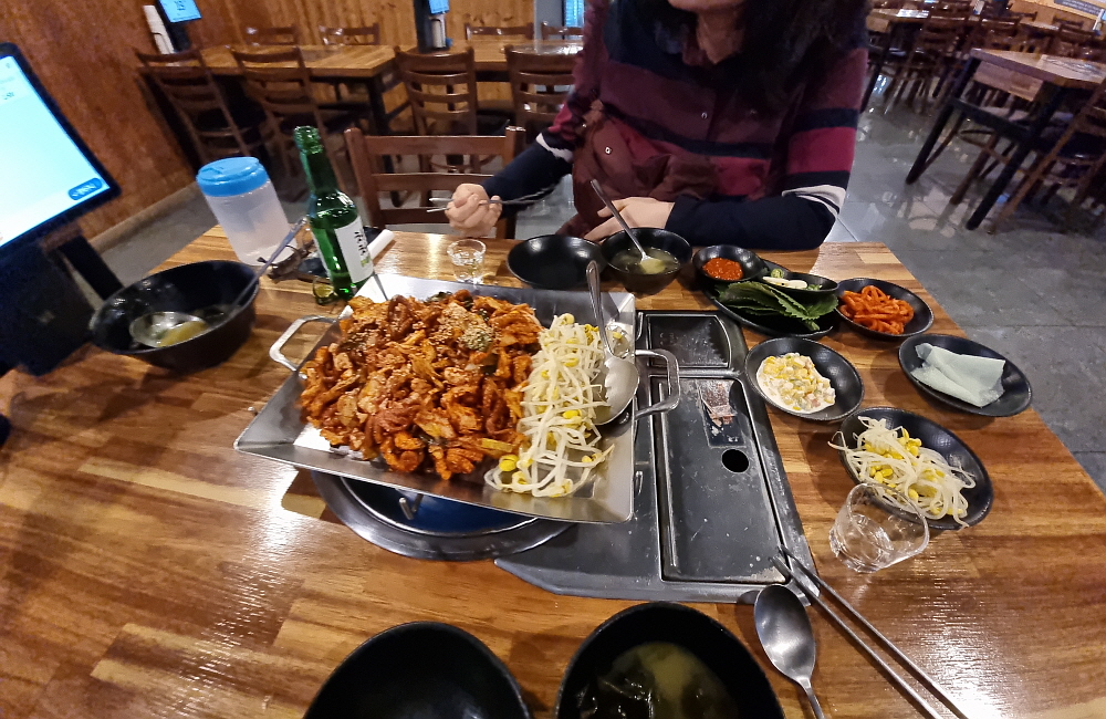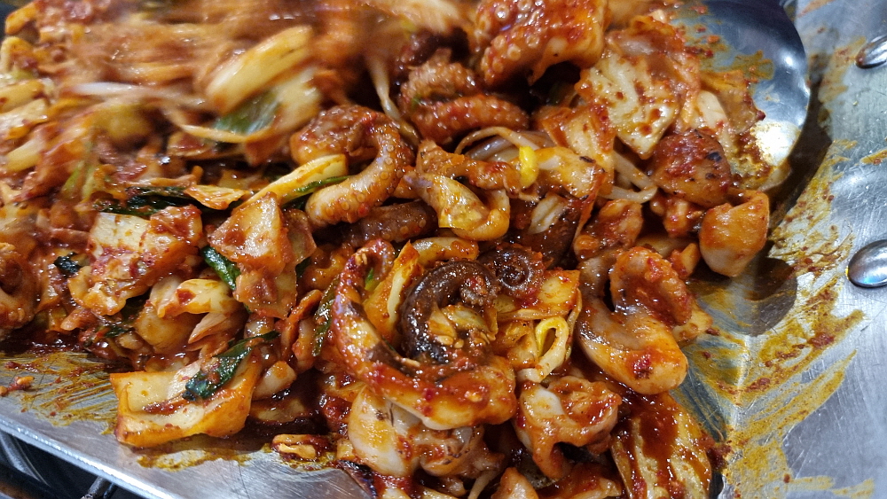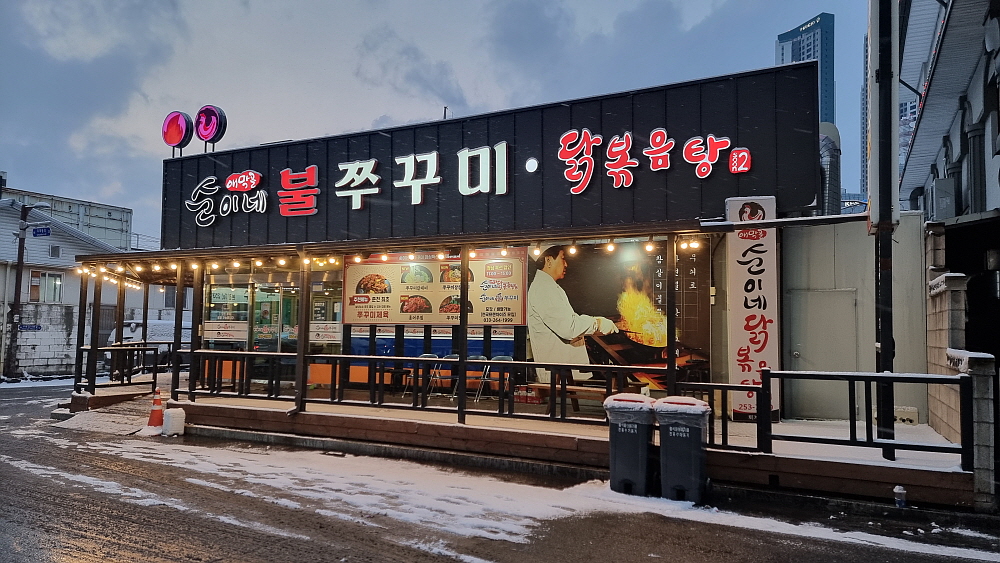 이런 날 적당한 아이템이 있다. 바로 추위를 날려버릴 화끈하게 매운 맛이다. 맵질이기는 하지만 이런 날은 한 번 도전해 볼만한 컨디션이다. 우리는 과감하게 간판마저 매워보이는 이집으로 들어갔다. 상호가 좀 긴 편인데 '애막골 순이네 불쭈꾸미와 닭볶음탕' 이라는 집이다. 상호에 직관적으로 모든 정보가 들어 있다. 여긴 매운 쭈꾸미와 닭볶음탕을 파는 집이다. 매운 닭볶음탕이 끌리기는 했지만 역시 매운맛은 오징어나 문어, 낙지 그리고 쭈꾸미 같은 친구들이 어울린다. 생긴게 비슷한 이 친구들은 많이 올라가면 조상이 같지 않을까 싶기도 하다.