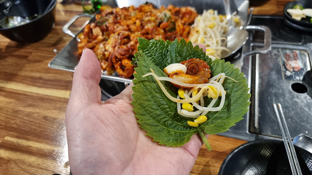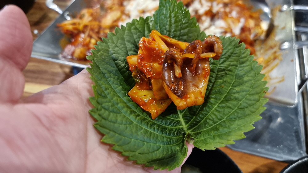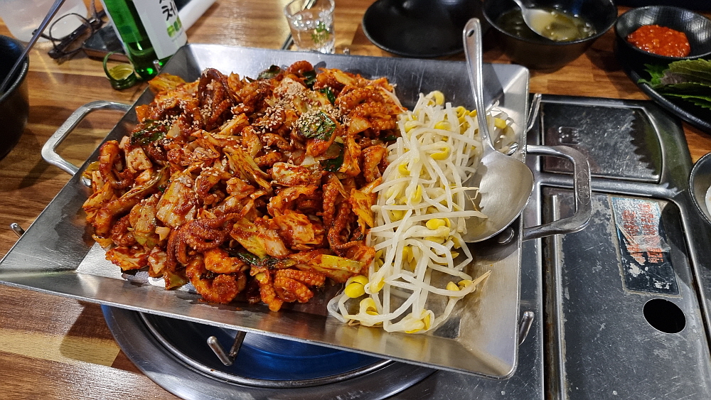 화끈한 맛을 찾아 왔지만 아주 매운 맛은 겁이나서 도전하지 못하고 중간맛을 주문했다. 중간맛 도전도 개인적으로는 많은 용기가 필요한 일이다. 설마 죽기야 하겠냐는 마음으로 주문했다. 손님 테이블에 불을 피우고 판에 쭈꾸미를 올려 주긴 하지만 쭈꾸미는 이미 주방에서 다 조리가 되어 나오는 방식이다. 매운 맛을 중화시킬 콩나물을 많이 올리고 왜 그런지 몰라도 매운 쭈꾸미는 꼭 깻잎에 싸 먹는다. 둘의 궁합이 잘 맞길래 이런 레시피가 나왔을 것이다. 매운 쭈꾸미의 가장 친한 친구는 밥이 아니라 소주다. 역시 이런 자리에는 소주가 있어야 한다.