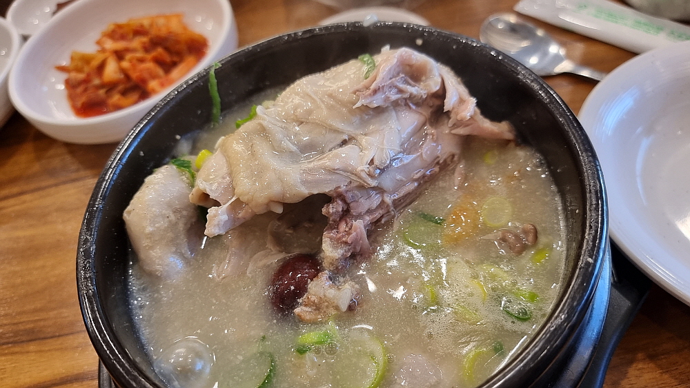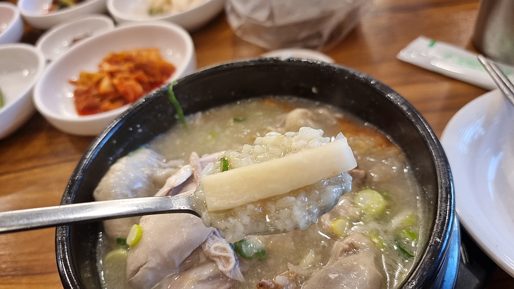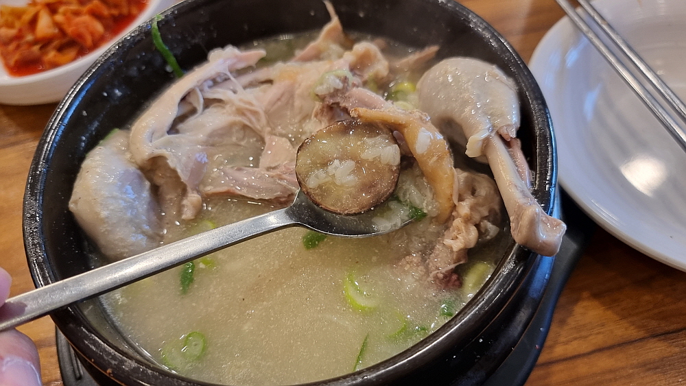 하지만 영양에서는 아무래도 백숙보다는 삼계탕이 더 고급이라 하겠다. 당연히 한 끼 치고는 값도 비싼 편이다. 이집은 특히 그런 느낌이었다. 누룽지가 들어간 이집의 시그니쳐 삼계탕의 가격은 무려 18,000원이다. 삼계탕이 많이 올랐다고는 하지만 보통은 15,000원을 넘지 않는데 여긴 그런 곳에 비하면 분명 더 센 가격의 집이다. 삼계탕에 누룽지가 들어가는 것은 다른 집에선 보기 드문 일인데 먹어보니 이런 조합이 나쁘지 않았다. 한 그릇에 이런 저런 약재까지 더하니 값은 나가도 분명 몸에는 좋을 것이다.