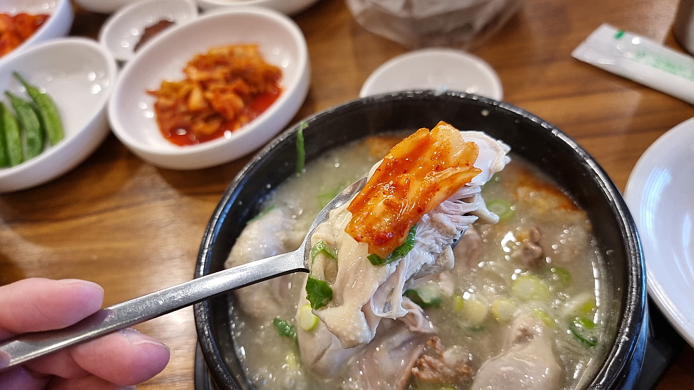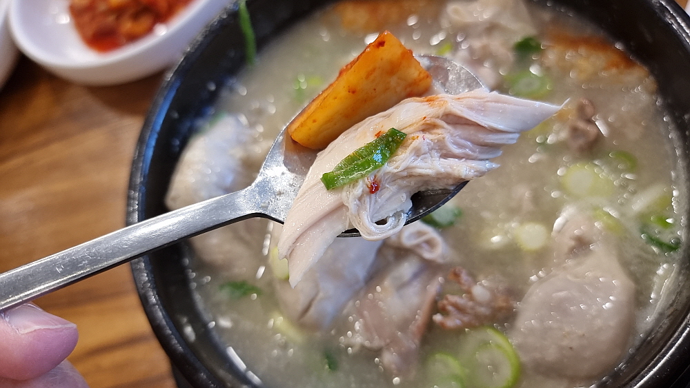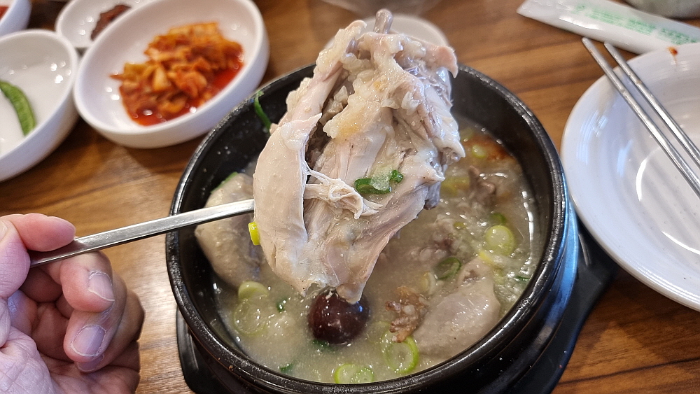 백숙에 들어간 닭과 달리 삼계탕의 닭은 어린 영계다. 당연히 살이 더 부드럽고, 야들거린다. 물론 맛도 좋다. 하지만 아무래도 크기가 작고, 씹는 맛은 좀 덜한 법이다. 우리나라 사람들이 너무 영계를 좋아하다 보니 병아리에서 출하하는 닭의 시기가 너무 짧은 것이 아니냐는 의견도 있을 정도다. 하지만 먹어보면 확실히 영계가 식감은 참 부드럽다. 거기에 한방재료와 찹쌀, 그리고 누룽지가 들어갔으니 호사도 이런 호사가 없다. 하지만 이집의 삼계탕은 가능하다면 빨리 먹어야 한다. 안 그러면 국물이 거의 없이 죽처럼 된 삼계탕을 먹게 될 것이다.