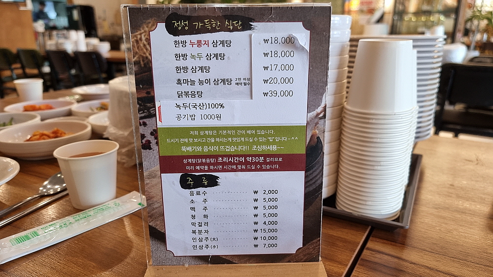 하지만 영양에서는 아무래도 백숙보다는 삼계탕이 더 고급이라 하겠다. 당연히 한 끼 치고는 값도 비싼 편이다. 이집은 특히 그런 느낌이었다. 누룽지가 들어간 이집의 시그니쳐 삼계탕의 가격은 무려 18,000원이다. 삼계탕이 많이 올랐다고는 하지만 보통은 15,000원을 넘지 않는데 여긴 그런 곳에 비하면 분명 더 센 가격의 집이다. 삼계탕에 누룽지가 들어가는 것은 다른 집에선 보기 드문 일인데 먹어보니 이런 조합이 나쁘지 않았다. 한 그릇에 이런 저런 약재까지 더하니 값은 나가도 분명 몸에는 좋을 것이다.