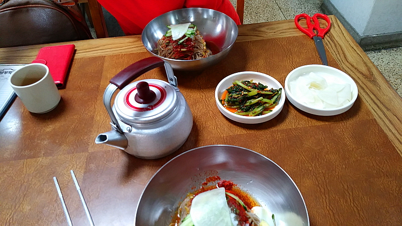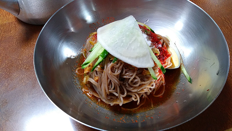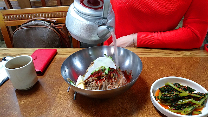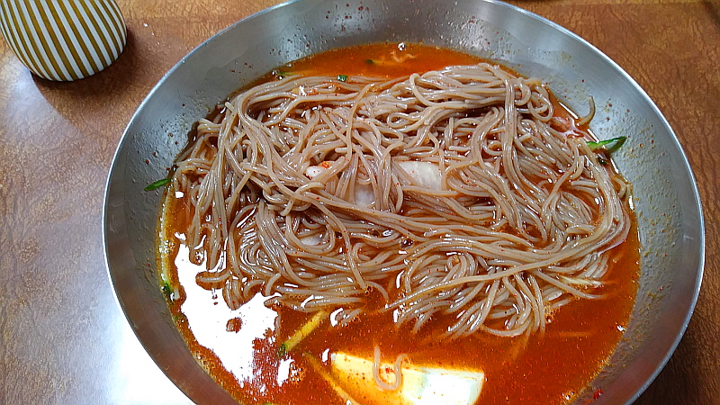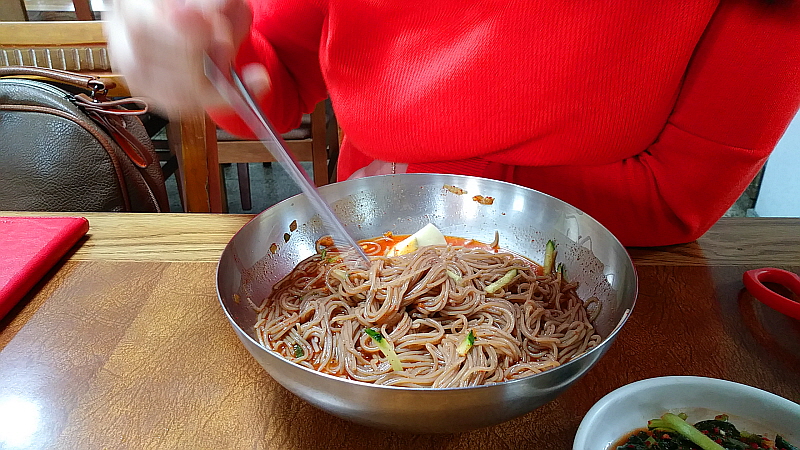 우리는 서둘러 막국수를 두 개 주문했다. 이집은 원조집들 대부분이 그렇듯이 비빔이나 물의 구분이 없다. 그저 나오는 막국수에 육수를 덜 부으면 비빔이 되는 것이고 나처럼 물을 많이 부으면 물 막국수가 되는 것이다. 이런 방식이 얼마나 반가운지 모른다. 포천에도 철원막국수가 이런 방식으로 음식이 나온다. 늘 그렇듯이 물을 조금 덜 붓는 사람도 있고, 넘칠 정도로 듬뿍 부어서 먹는 사람도 있다. 막국수 면 위로는 특이하다는 비주얼의 고추가루가 뿌려져 있었다. 하지만 참 이상하게도 면을 먹는 동안 고추가루의 존재는 그렇게 거의 느껴지지 않았다.