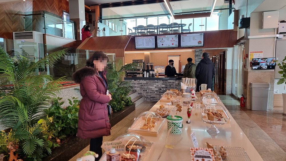 말 그대로 형형색색의 맛나보이고, 화려한 빵들이 중간에 터줏대감처럼 자리를 잡고 있다. 마치 "빵을 사지 않으면 여길 지날 수 없다!" 이렇게 엄포를 놓는 것 같았다. 하지만 지금 막 막국수로 배를 채운 우리 눈에 빵이 들어올리 없다. 그대로 패스~ 여긴 커피 값이 좀 센 편이다. 정확히는 기억이 나지 않지만 아메리카노가 5,000원이 넘었던 것 같다. 암튼 할인도 된다 하니 부담없이 분위기 좋은 카페에서 식후 여유를 즐기기로 했다. 여행 중에 만나는 맛난 식당과 분위기 좋은 카페는 일종의 행운이다.