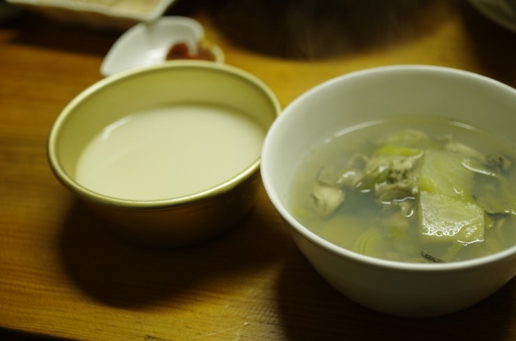 김치를 한다고는 하지만 딸랑 두식구만 사는 친구 집에서 엄청난 양의 김치를 할리는 없고, 그저 간단히 우리 먹을 정도의 양을 만들고 있었다. 먼저 눈에 띈 것은 신선한 굴로 무친 굴 무침이었다. 매운 맛을 즐기는 친구네는 고추가루도 내겐 좀 매웠다. 하지만 굴이 어찌나 신선하던지 그저 스르륵 입속에서 미끄러져 들어가는 느낌이었다. 별 다른 양념을 하지 않고 신선한 굴과 고추가루와 소금으로 적당히 양념을 한 건강식이었다. 내게 좋아하냐며 내 놓은 굴국도 별 다른 양념이 없이 그저 간간한 굴향이 그대로 밴 단촐한 맛이었다. 겉절이는 물론 어느 술이나 다 어울리지만, 막걸리 회사를 다니는 제수씨의 배려로 역시 후레쉬한 막걸리와 먹게 되었다. 신선한 음식들이 내는 하모니가 몸을 건강하게 만드는 느낌이었다. 밖에서는 별들이 쏟아지고, 간간히 개들이 짖고, 후레쉬한 음식들은 내 몸으로 들어가고 거하게 취해오는 막걸리의 하모니 이런게 시골 사는 재미가 아닐까 했다.