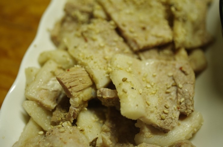 오늘의 주인공인 김치 겉절이는 가장 나중에 등장했다. 깨가 듬뿍 들어간 달콤하고 매콤한 김치가 질리지도 않으면서 맛이 정말 좋았다. 신선한 겉절이는 영양과 강한 맛을 함께 느끼게 해주는 우리네 음식이다. 이런 맛은 아마도 식당에서는 보기 힘들 것이다. 친구는 빰장이라는 된장같이 생긴 것을 가지고 나왔다. 빰장은 충청도에만 있는 장이라고 한다. 메주를 그냥 빠아서 김치국물과 섞은 것이 빰장이라고 한다. 이정식의 주안상에서는 이런 저런 희안한 음식을 많이 만나겠지만, 빰장은 나도 정말 처음 보는 장이었다. 메주의 맛이 강하게 나면서 된장처럼 장 노릇을 해주는 것이 참 신기한 음식이었다. 빰장에 돼지고기를 찍어 먹으면서 겉절이를 먹고, 막걸리를 마셨다.