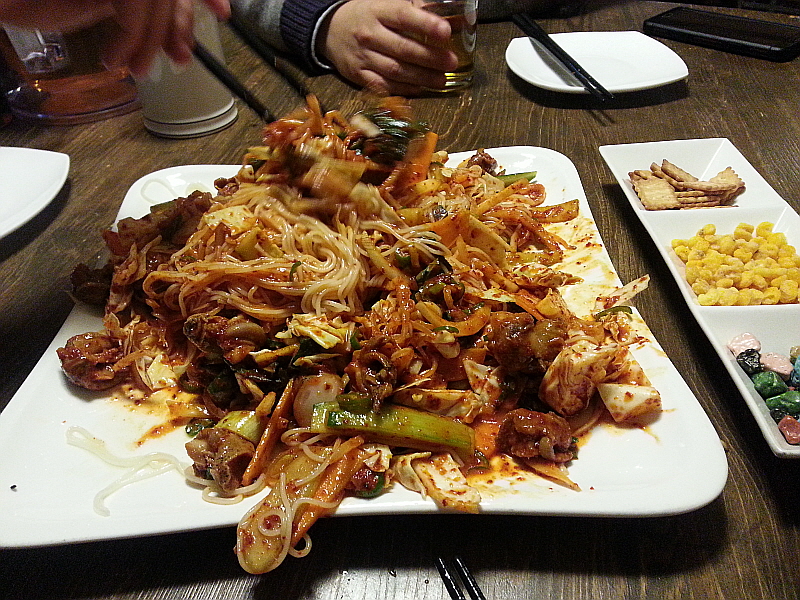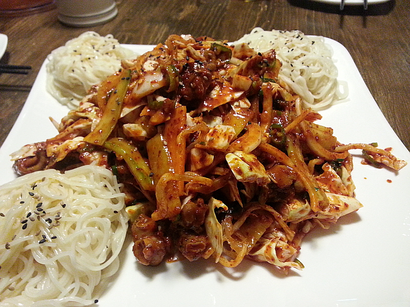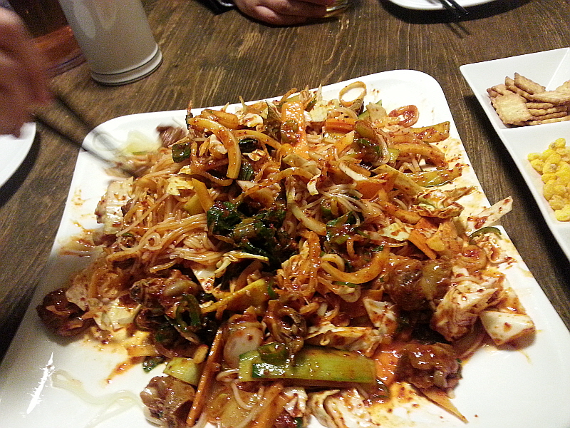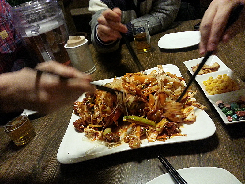 이런 조합은 사실 술꾼이라는 누구나 좋아할 만한 것이고 너무나 익숙한 것이다. 이런 조합의 음식을 마다할 술꾼은 없을 것이다. 우리도 커다란 피쳐 잔을 운동하듯이 들고 서로에게 술을 권하며 한마디에 한잔씩 홀짝거리기 시작했다.손이 바빠지는 순간이었다. 이집의 골뱅이 무침은 달달하고 새콤하면서 적당한 맵기까지 아주 안성맞춤이다. 거기에 겨울엔 친해지지 않는 싱싱한 채소들을 함께 먹으니 뭐 비록 술잔을 기울이는 간단한 자리이지만 몸에도 좋긴 할 것이다. 누군가 그랬다. 좋은 마음으로 즐겁게 먹으면 다 약이 된다고... 이것이 약이다 생각하고 먹기로 했다.