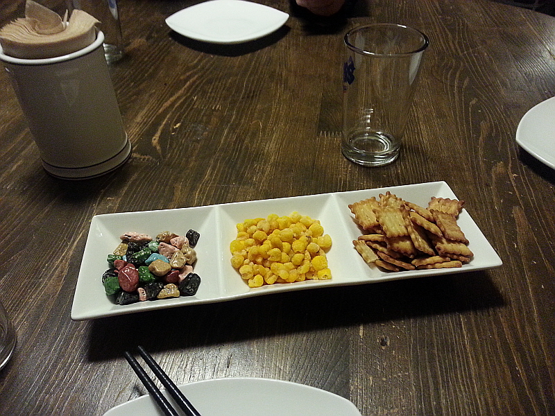 사진에도 있지만 기본 안주로 옥수수튀김과 과자 그리고 석기시대라는 쵸콜릿이 나온다. 저 석기시대 쵸콜릿을 보면 큰 아들놈 사주던 생각이 난다. 어릴적 우리 큰애는 저 석기시대 쵸콜릿을 무척이나 좋아했었다. 내가 몇 개 뺏어 먹기라도 하면 눈물을 보이며 감추기까지 했었다. 이젠 그 아들이 군대를 가려하니 참 세월이 빠르기도 하지...그래서인가 나도 집에선 전혀 쵸콜릿 같은 음식에 관심도 없다가 이렇게 나오면 제법 집어 먹게 된다. 쩝!