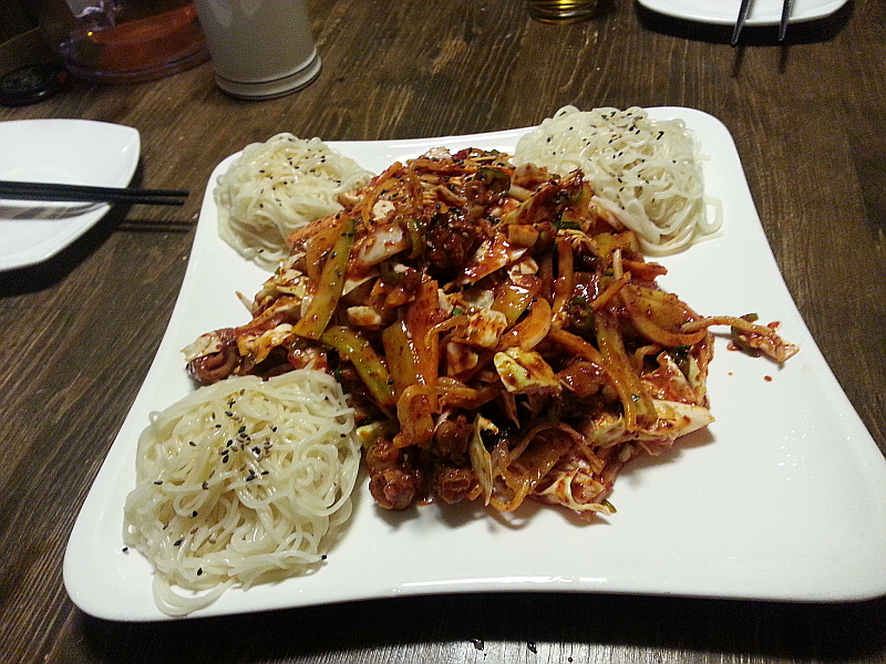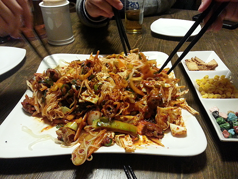 이런 조합은 사실 술꾼이라는 누구나 좋아할 만한 것이고 너무나 익숙한 것이다. 이런 조합의 음식을 마다할 술꾼은 없을 것이다. 우리도 커다란 피쳐 잔을 운동하듯이 들고 서로에게 술을 권하며 한마디에 한잔씩 홀짝거리기 시작했다.손이 바빠지는 순간이었다. 이집의 골뱅이 무침은 달달하고 새콤하면서 적당한 맵기까지 아주 안성맞춤이다. 거기에 겨울엔 친해지지 않는 싱싱한 채소들을 함께 먹으니 뭐 비록 술잔을 기울이는 간단한 자리이지만 몸에도 좋긴 할 것이다. 누군가 그랬다. 좋은 마음으로 즐겁게 먹으면 다 약이 된다고... 이것이 약이다 생각하고 먹기로 했다.